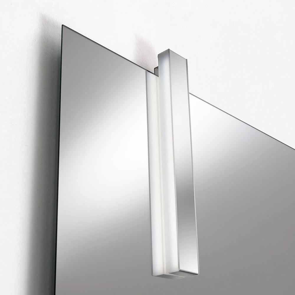 Pasqyra me formë 50x100 cm i shton vertikalitet dhe personalitet dhomës, ndërsa llamba LED e kromit siguron ndriçim funksional dhe të shpërndarë, perfekt për zonën e lavamanit.