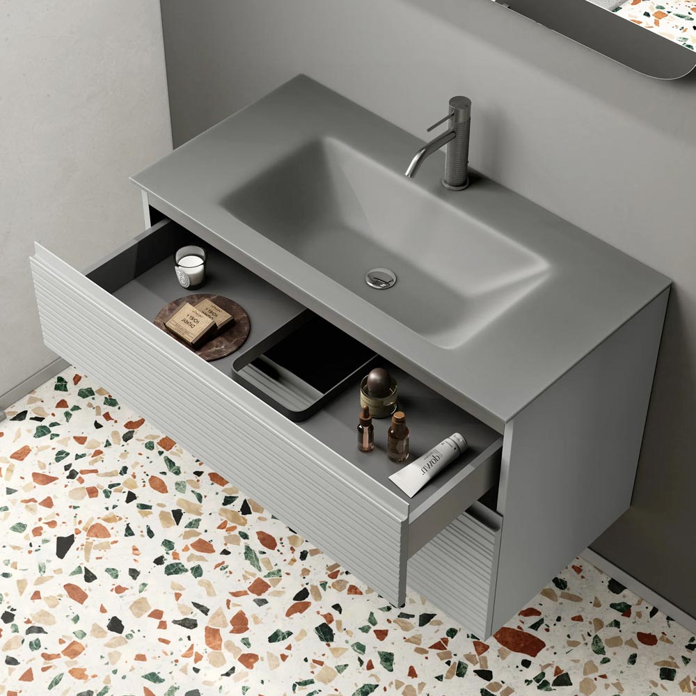 Lavamani prej qelqi saten gri është zemra e kompozimit: një zgjidhje vizualisht mbresëlënëse që kombinon lehtësinë, shkëlqimin dhe rezistencën, duke transformuar gjestet e përditshme në një përvojë dizajni.