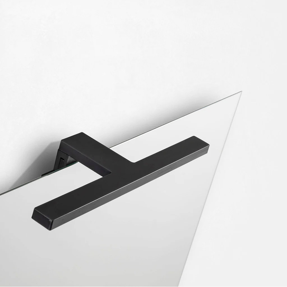Llampa LED e zezë plotëson kompozimin me një theks grafik të guximshëm, duke ofruar ndriçim funksional dhe skenografik, ideal për të krijuar një atmosferë intime dhe të sofistikuar në zonën e lavamanit.