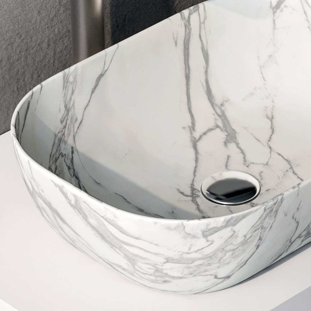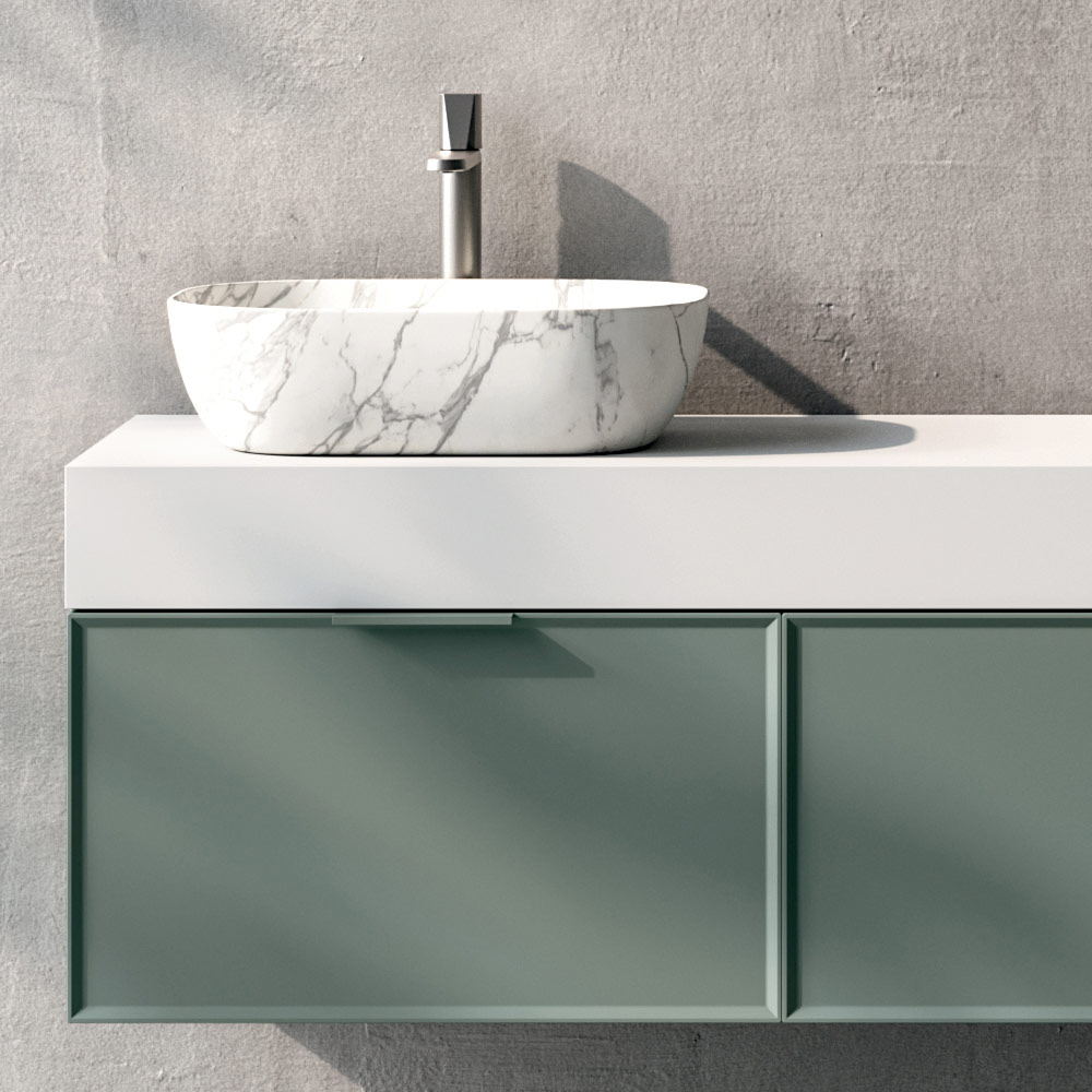 Sipërfaqja e lavamanit me ngjyrë të bardhë mat shoqëron në mënyrë harmonike lavamanin prej qeramike me efekt Calacatta , i karakterizuar nga një sipërfaqe e ndritshme dhe damarë delikate që të kujtojnë mermerin, duke i dhënë një hije të tërë përbërjes.