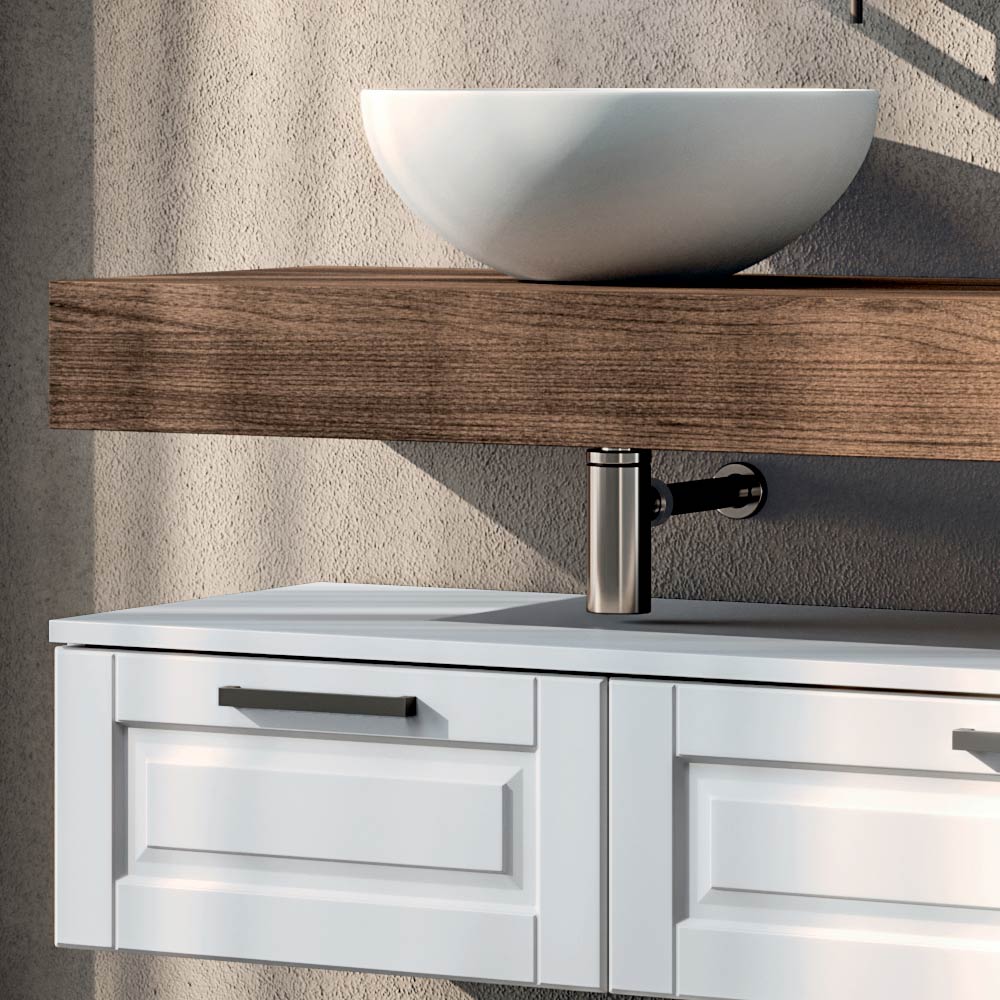 Një kompozim banjoje me një dizajn bashkëkohor që kombinon pastërtinë e të bardhës mat me ngrohtësinë natyrale të lisit , duke krijuar një ekuilibër materiali elegant dhe të përjetshëm.