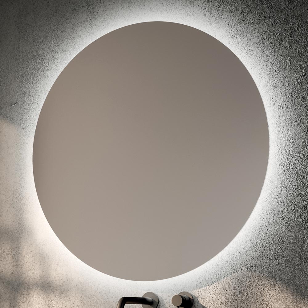 Lavamani i rrumbullakët prej rrëshire , me profilin e tij të butë dhe minimal, integrohet në mënyrë të përkryer me pjesën e sipërme, ndërsa pasqyra me ndriçim nga prapa amplifikon shkëlqimin dhe i jep thellësi vizuale murit, duke ndihmuar në krijimin e një atmosfere relaksuese dhe moderne.