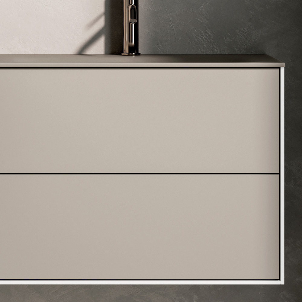Pika qendrore e zonës së lavamanit është lavamani prej qelqi të mbuluar me akull në ngjyrë gri pëllumbi , një zgjidhje e sofistikuar që kombinon lehtësinë vizuale dhe stilin bashkëkohor. Sipërfaqja e mbuluar me akull rrit dritën dhe krijon një efekt të sofistikuar.