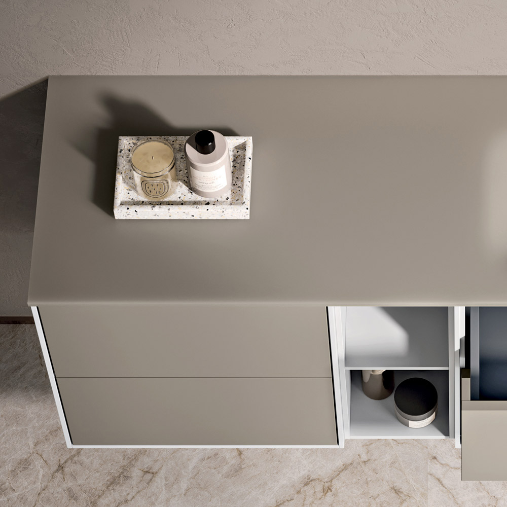 Përbërja karakterizohet nga 2 baza të varura me nga 2 sirtarë të bollshëm secila , ideale për organizimin më të mirë të aksesorëve dhe produkteve të banjës, duke ruajtur një estetikë të pastër dhe të rregullt.