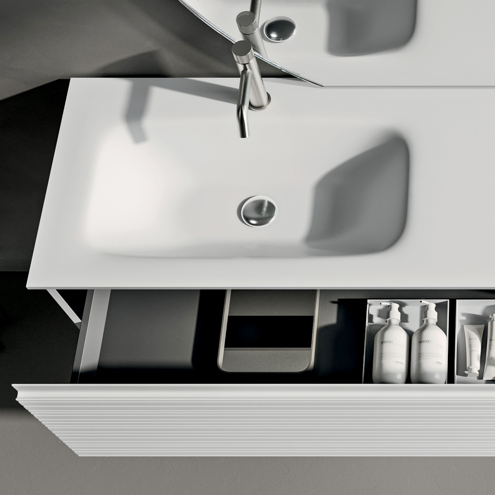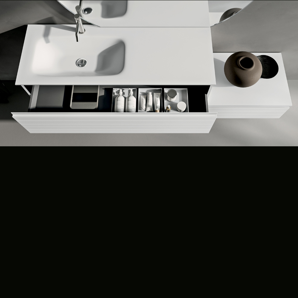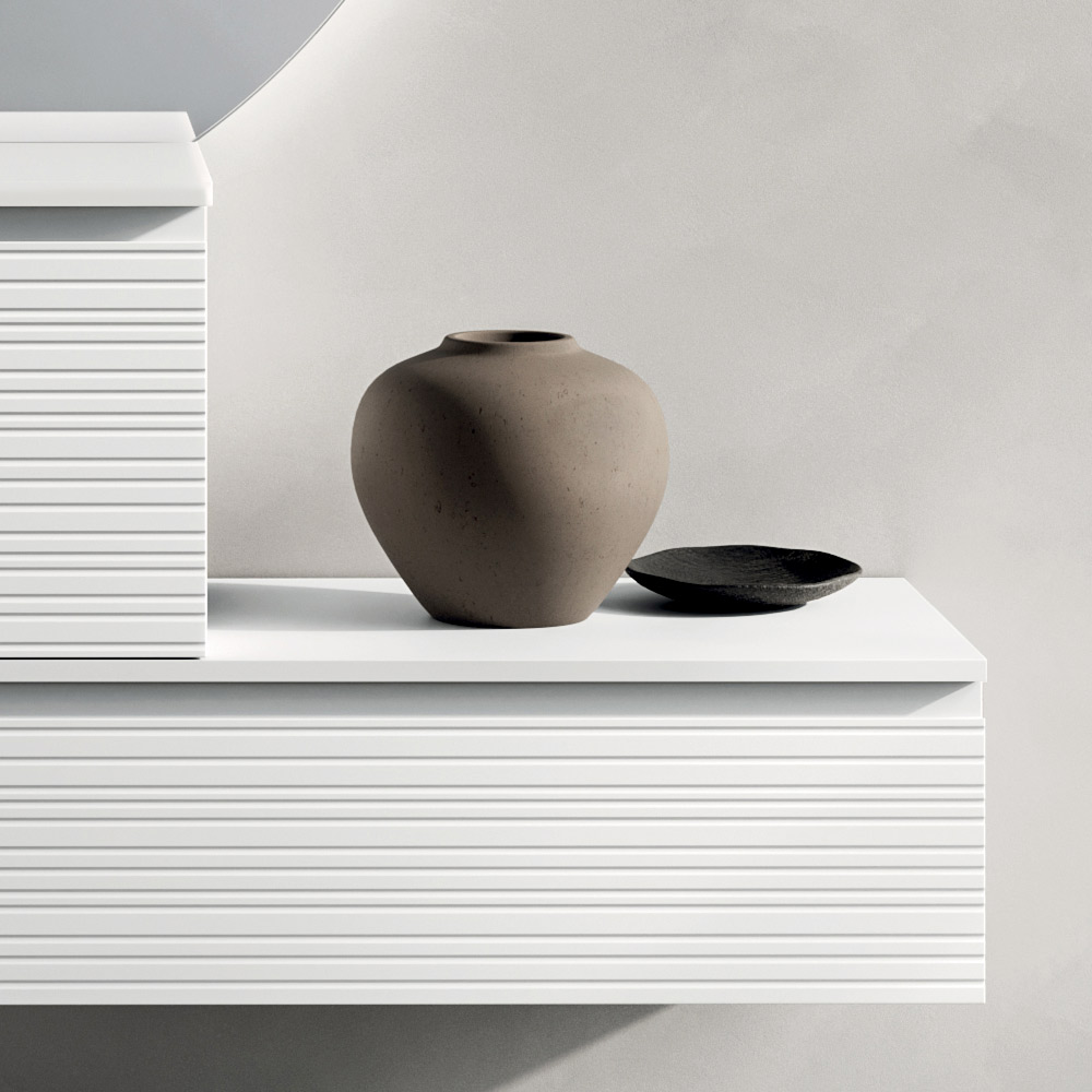 Dollapi i banjës me ngjyrë të bardhë mat, i varur, paraqet linja të pastra dhe përmasa të balancuara, duke ofruar një zgjidhje funksionale dhe diskrete për ruajtje. Përfundimi mat rrit pastërtinë e ngjyrës, duke e bërë përbërjen ideale si për hapësirat e banimit ashtu edhe për projektet me kontratë të nivelit të lartë.