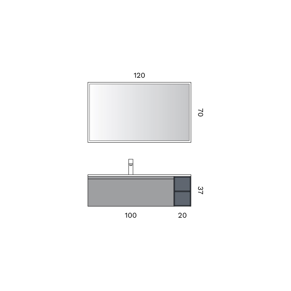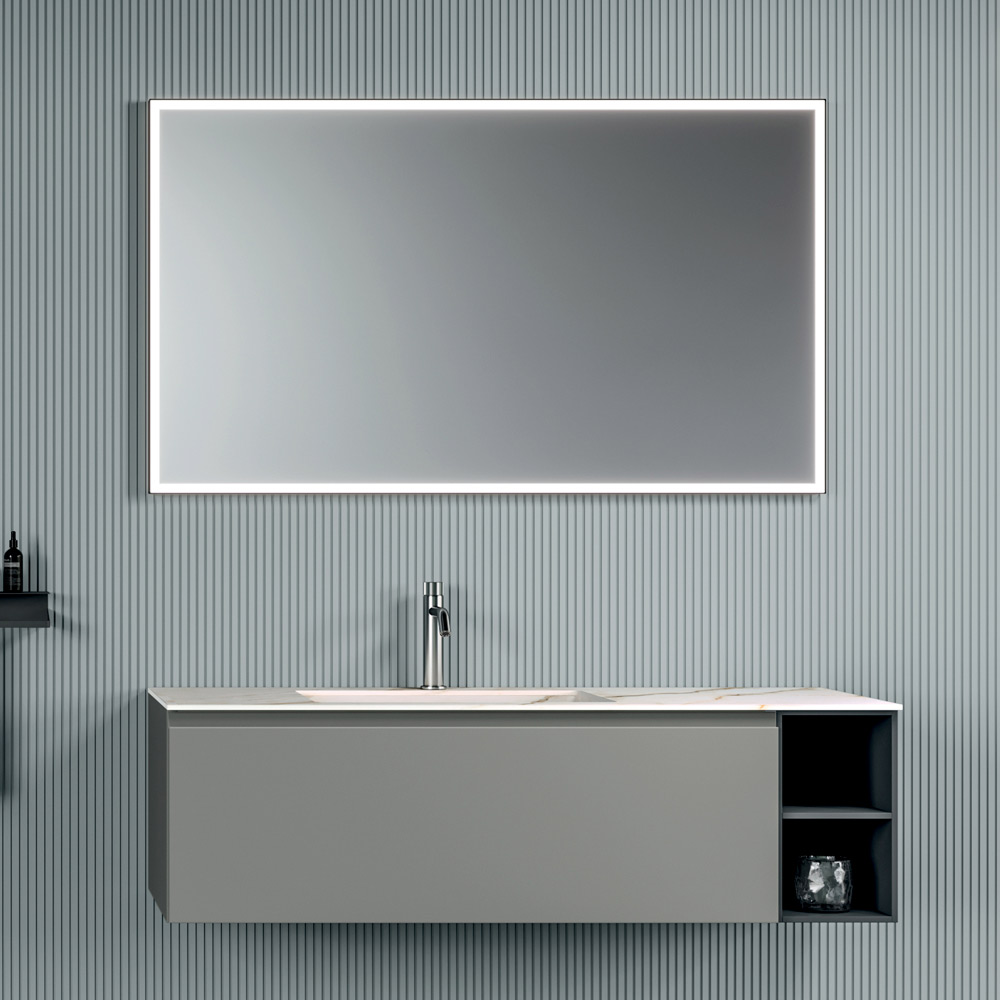 Kompozimi plotësohet nga pasqyra LED me ndriçim nga prapa , e projektuar për të ofruar një dritë uniforme dhe mbështjellëse, perfekte për të përmirësuar hapësirën e banjës dhe për të siguruar ndriçim funksional dhe elegant.