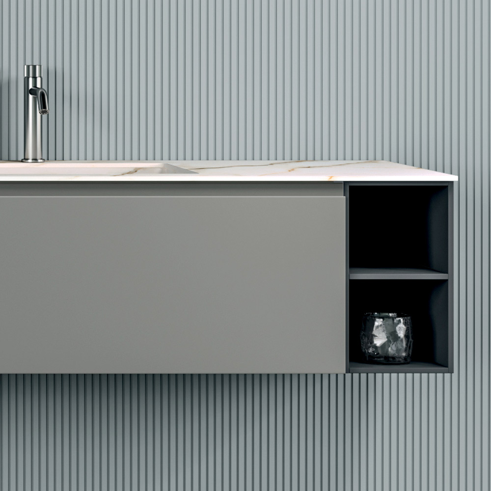 Baza e varur me shportë të madhe , e propozuar në një ngjyrë gri mat , garanton një zgjidhje të bollshme magazinimi duke ruajtur një estetikë thelbësore dhe të rregullt.