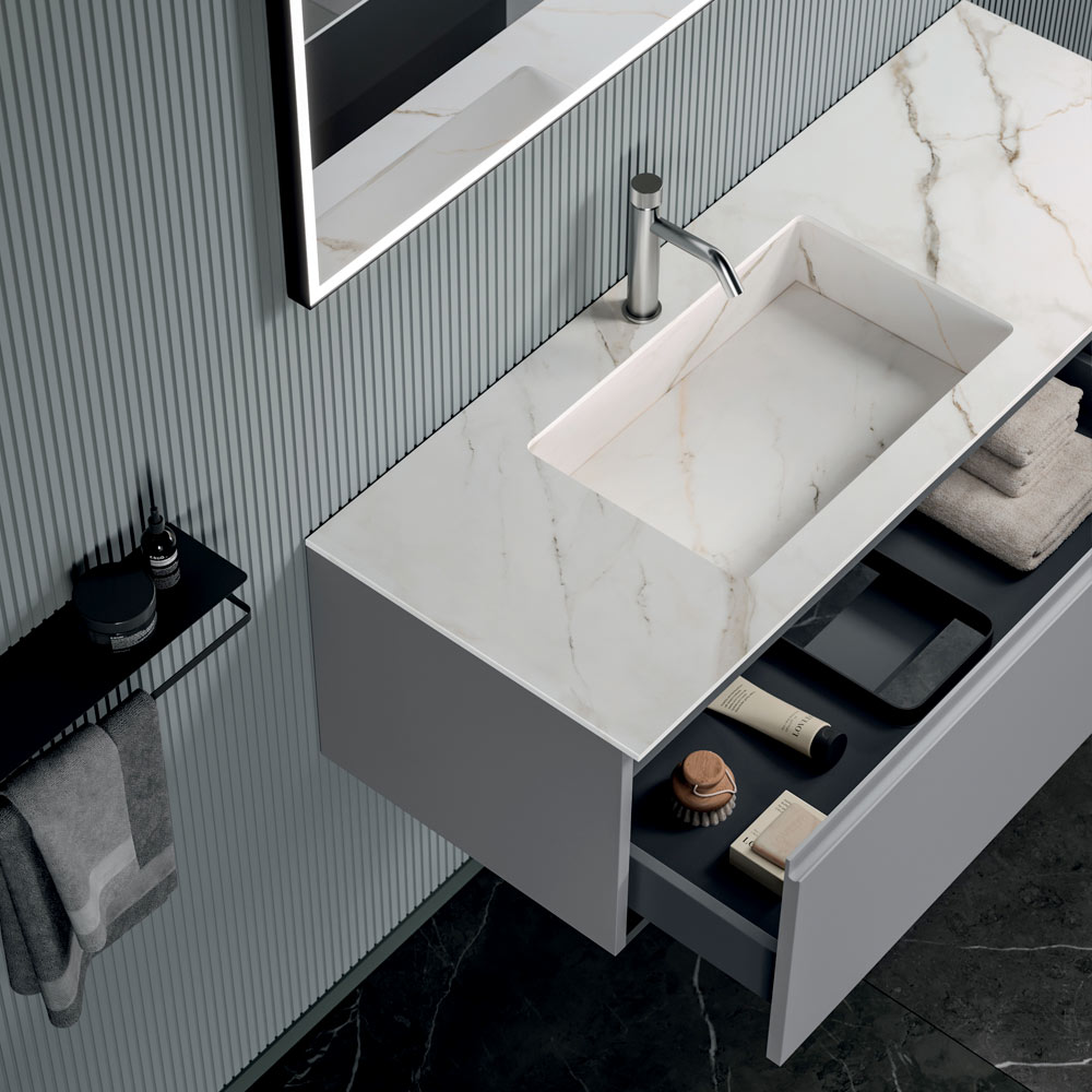 Banaku i integruar i lavamanit prej guri Calacatta Gold është zemra estetike e kompozimit. Venat elegante dhe të ndritshme kujtojnë fisnikërinë e mermerit, ndërkohë që ofrojnë gjithashtu qëndrueshmëri, praktikë dhe lehtësi në mirëmbajtje.