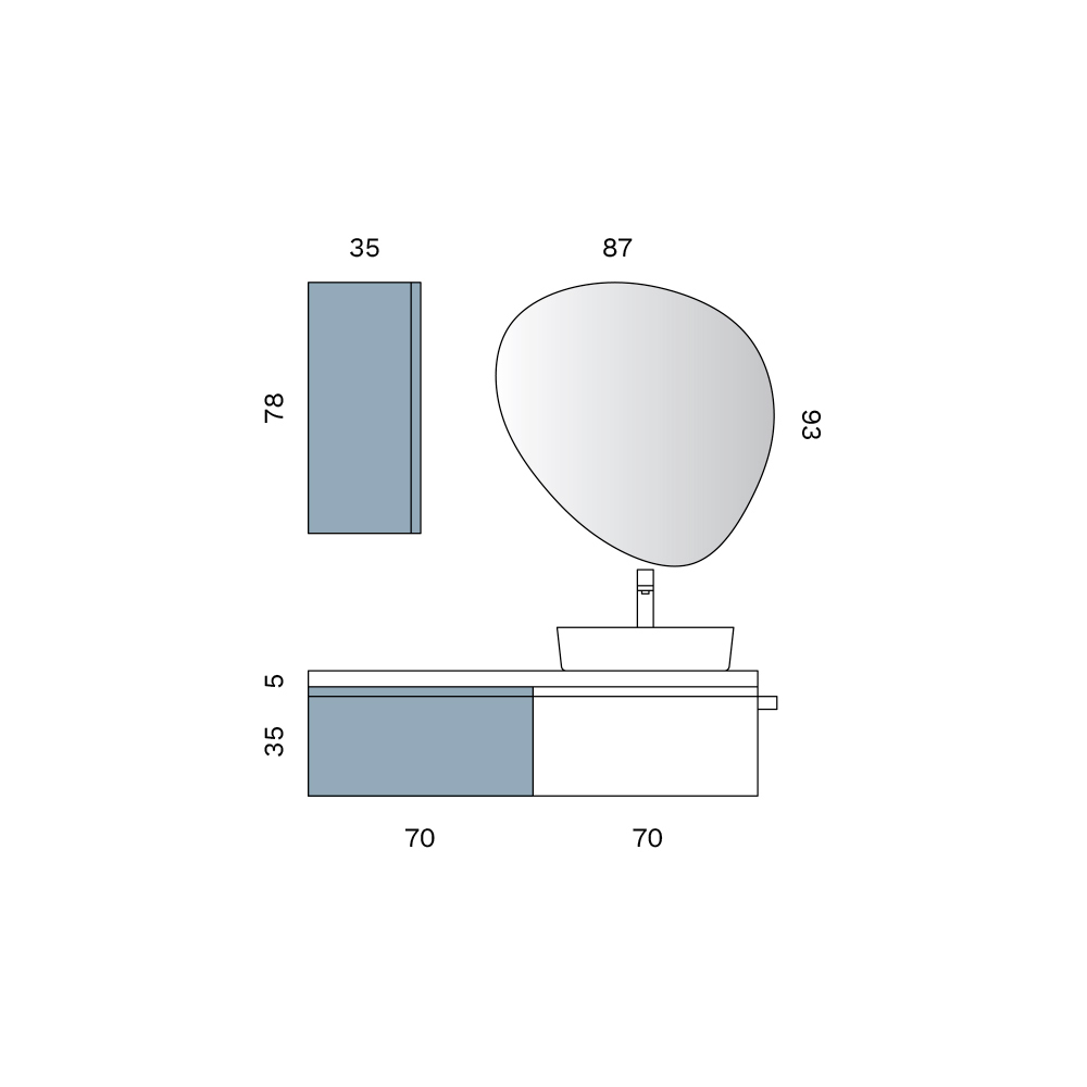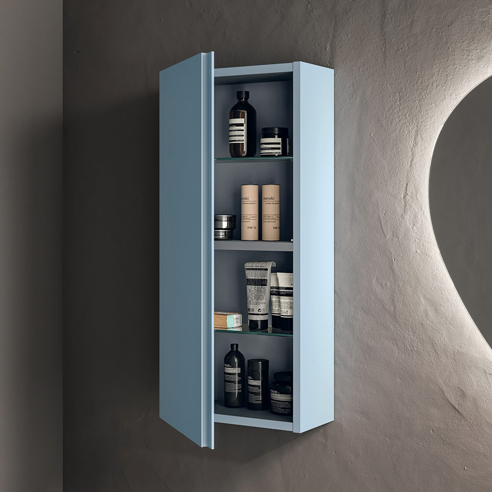 Njësitë bazë të montuara në mur me një shportë të madhe , me ngjyrë të bardhë dhe ngjyrë Tiffany, ofrojnë një zgjidhje praktike dhe diskrete për ruajtje, të përforcuar nga një sipërfaqe mat delikate dhe bashkëkohore. Linjat e pastra ndihmojnë në krijimin e një hapësire të pastër, vizualisht të lehtë dhe harmonike. Përfshihet edhe një mbështetëse peshqirësh e zezë.