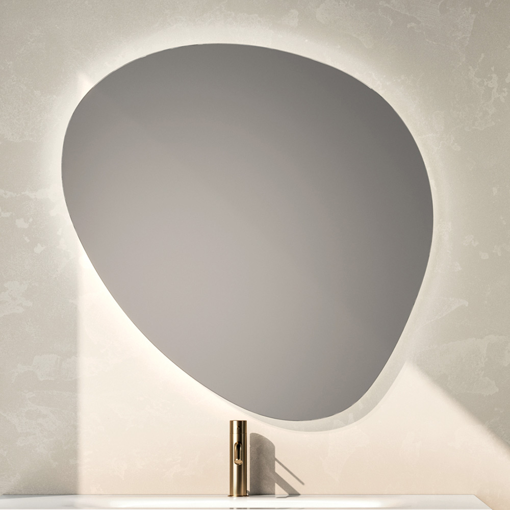 Pasqyra LED me formë bëhet një element i vërtetë mobilimi: forma e saj e butë dhe ndriçimi i integruar krijojnë një lojë të rafinuar drite që amplifikon perceptimin e hapësirës dhe i jep thellësi banjës.