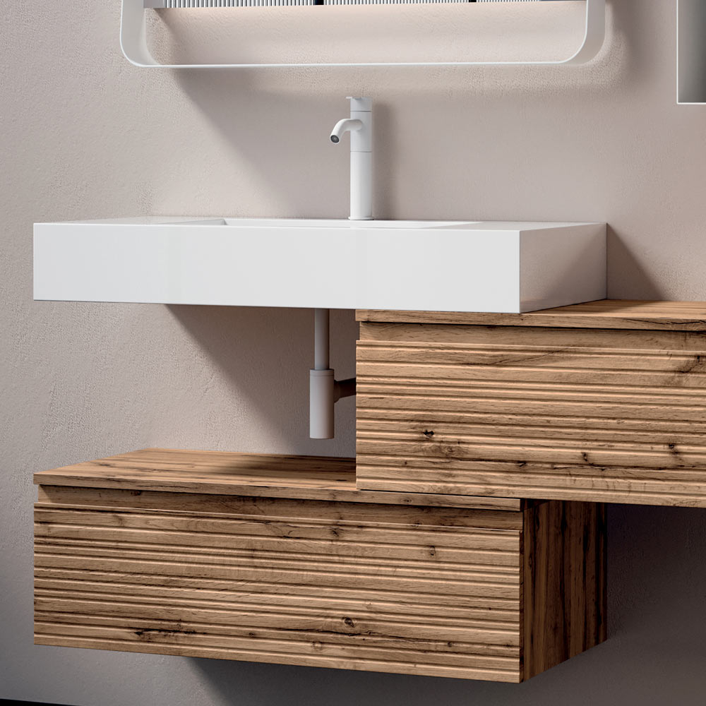 Dy lavamanët e banjës të montuar në mur me përfundim lisi , secila me një sirtar të bollshëm, ofrojnë një zgjidhje magazinimi funksionale dhe estetikisht të këndshme. Fijet e drurit i japin thellësi dhe karakter, duke krijuar një ekuilibër të përsosur midis dizajnit dhe natyralitetit.