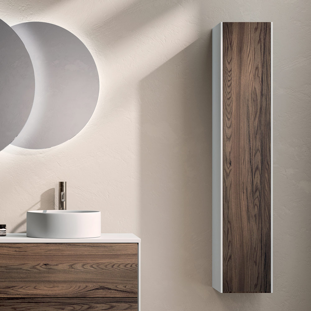 Një kompozim banjoje me një ndikim të fortë vizual, i karakterizuar nga ngrohtësia e materialit të lisit Rio dhe pastërtia e sipërfaqes së bardhë mat , të cilat së bashku krijojnë një ekuilibër të rafinuar midis natyrshmërisë dhe minimalizmit bashkëkohor.