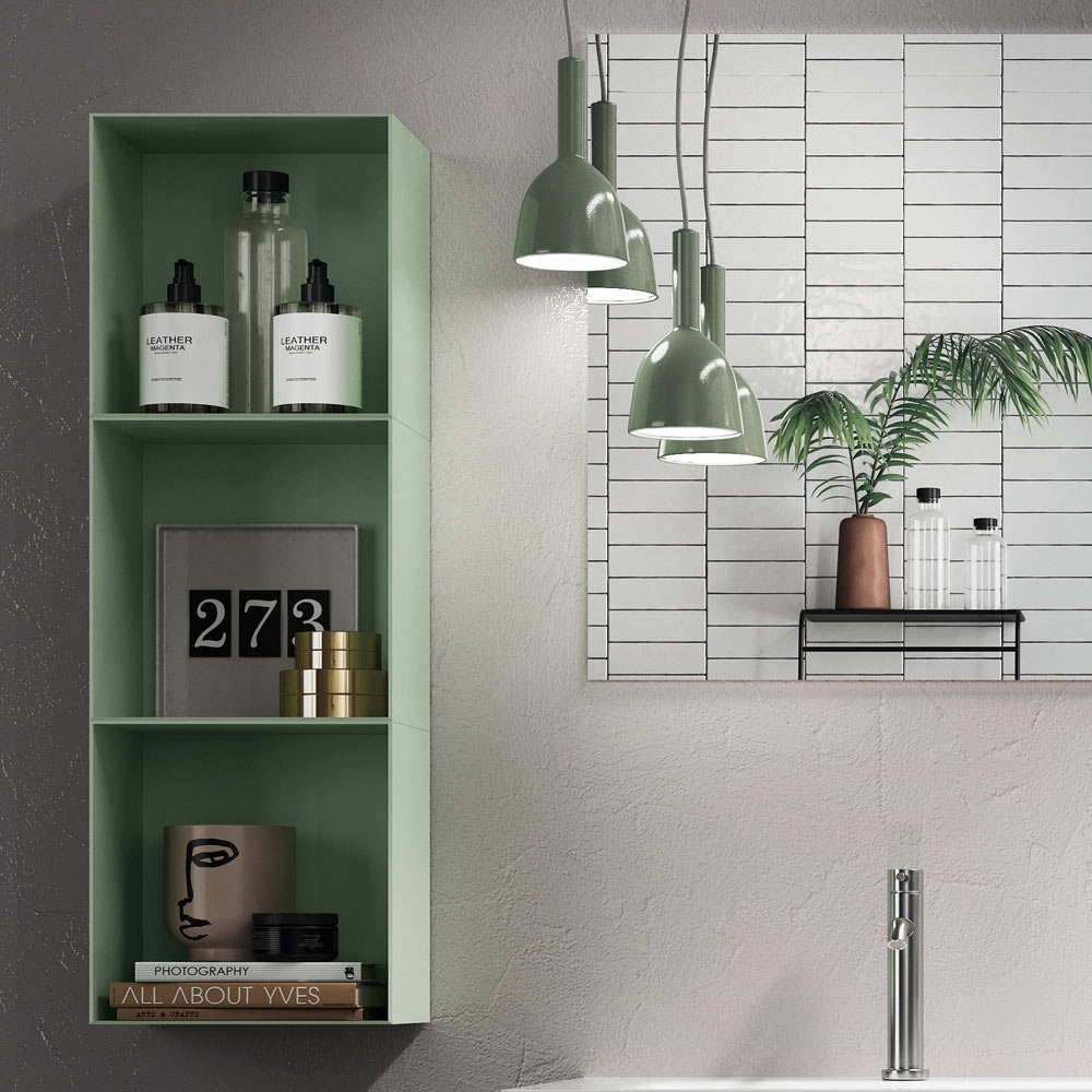 Përbërja e banjës me bazënë melaminë rezistente ndaj gërvishtjeve me ngjyrë lisi mjaltime 2 sirtarë plotësisht të nxjerrë dhe mbyllje të butë nga afër , pasqyrë drejtkëndore me llambë dhe lavaman dopio konsol në qeramikë të bardhë me shkëlqim . Gjithashtu përfshihen edhe 3 kube të varur në metal të llakuar RAL6021 me ngjyrë jeshile të zbehtë. Detajet e strukturës dhe sirtarët push-pull kombinohen me shumë elegancë, duke i dhënë strukturës aftësinë për t'u përshtatur me çdo nevojë. Kombinimi i materialeve dhe përfundimeve krijon një produkt unik që plotëson nevojat e cilësisë, stilit dhe funksionalitetit.