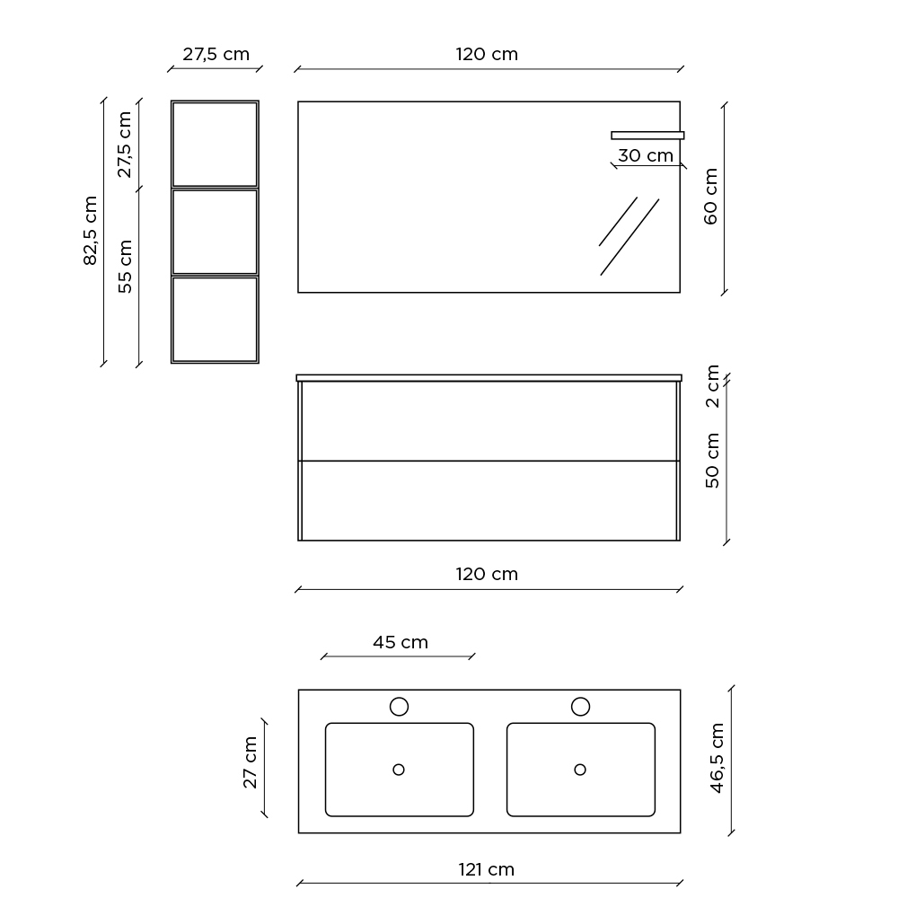 Dimensionet: Baza: L 121cm x D 46,5cm x Lartë 52cm Lavaman: L 45cm x D 27cm Pasqyra: H 60cm x L 120cm
