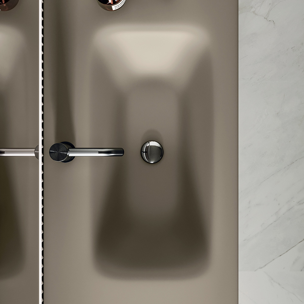 Lavamani prej qelqi saten në ngjyrë gri pëllumbi krijon një ndërveprim të rafinuar ton-mbi-ton me bazën, duke rritur lehtësinë vizuale të të gjithë kompozimit dhe duke i dhënë shkëlqim zonës së lavamanit.