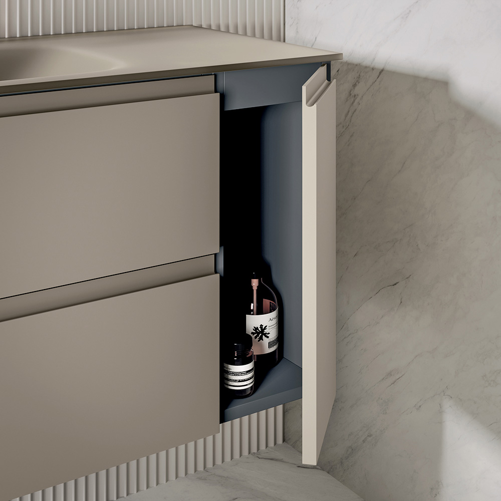 Një zgjidhje perfekte për ata që duan një dollap banjoje modern të varur në ngjyrë gri-pëllumbi , të karakterizuar nga materiale bashkëkohore, përfundime elegante dhe një estetikë të pastër të përshtatshme për banjo dizajni.