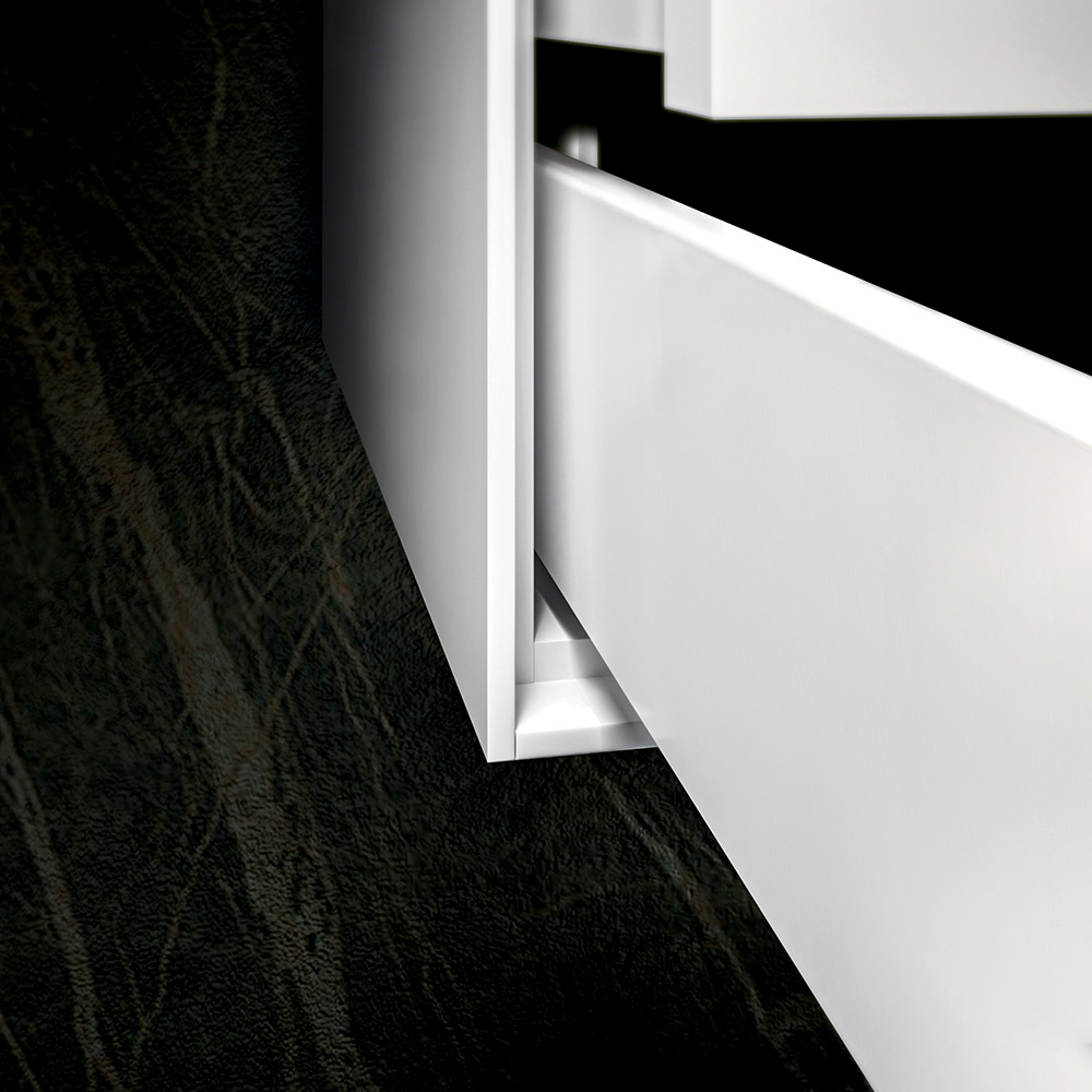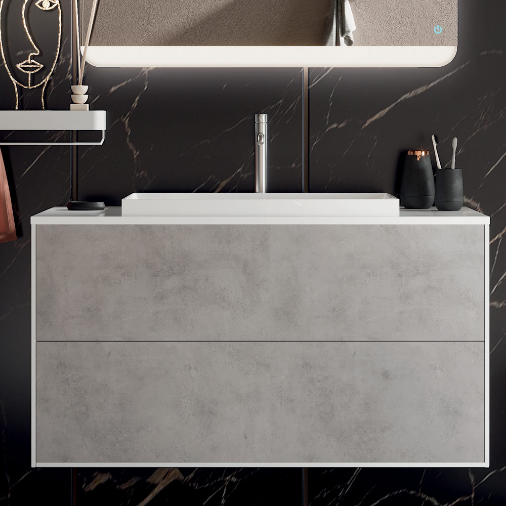 Përbërja e banjës e kompletuar me lavamanme rrëshirë të integruar , pasqyrë xhami me LED para dhe rrethuese dhe bazëmelamine rezistente ndaj gërvishtjeve ngjyrë çimento me 2 sirtarë plotësisht të nxjerrshëm dhe mbyllje të butë nga afër. Koleksioni i stilit modern kujton konceptet e butësisë dhe thjeshtësisë thelbësore. Përfundimet dhe materialet bashkohen për të krijuar një mobilje banjo elegante, cilësore dhe funksionale.