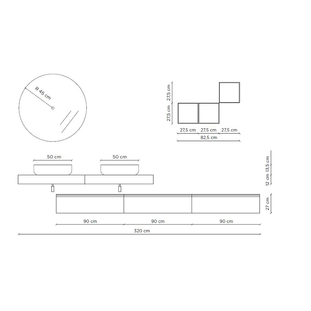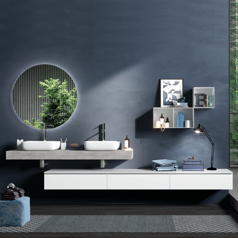 Përbërja e banjës e përbërë nga: 2 lavamane qeramike me shkëlqim të bardhë të mbështetur në dy maja në MDF të veshur dhe HPL ngjyrë çimentoje , një bazë në melaminë të bardhë me shkëlqim, rezistente ndaj gërvishtjeve dhe një pasqyrë e rrumbullakët me LED rrethues.