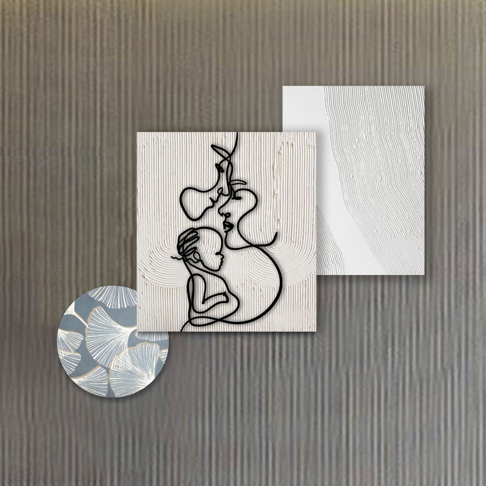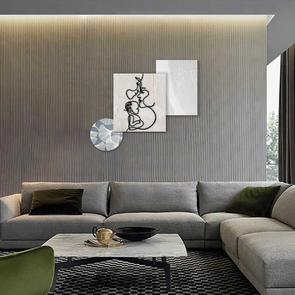 Përbërja e tre paneleve të formave dhe madhësive të ndryshme që kombinojnë dekorime lazer dhe printe . E përbërë nga tre panele në dru të stampuar : një i rrumbullakët me petale të bardha, një drejtkëndor që stilizon dashurinë e një familjeje dhe një drejtkëndor me vija në reliev të lartë. Përbërja e paneleve modulare : çdo panel është unik dhe mund të vendoset në mur sipas dëshirës, duke krijuar lojëra të mbivendosura gjithnjë në ndryshim. Kjo kompozim i stilit modern ka një ndikim të madh vizual dhe ngjall një ndjenjë dashurie dhe ngrohtësie tek shikuesi. Bashkimi i formave dhe ngjyrave të 3 paneleve krijon një lojë vizuale që përshtatet për t'u vendosur në çdo dhomë të shtëpisë.
