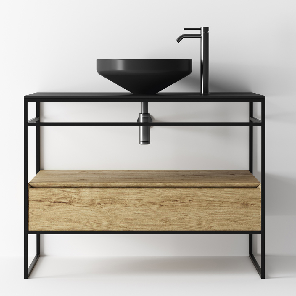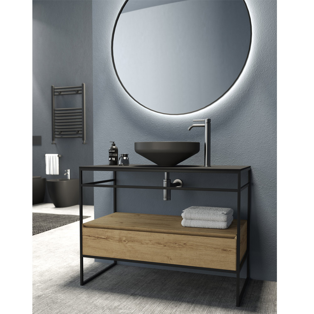 Përbërja e mobiljeve të banjës tërësisht e prodhuar në Itali e përbërë nga një lavaman qeramik me finiturë të zezë mat , bazë me strukturë në çelik inox të zi mat dhe sipër në qeramikë të zezë mat me sirtar praktik në dru lisi me prerje 45° dhe mbyllje të ngadaltë. Kompozimi plotësohet nga pasqyra e rrumbullakët e murit me ndriçim të pasëm me kornizë alumini me finiturë të zezë mat.