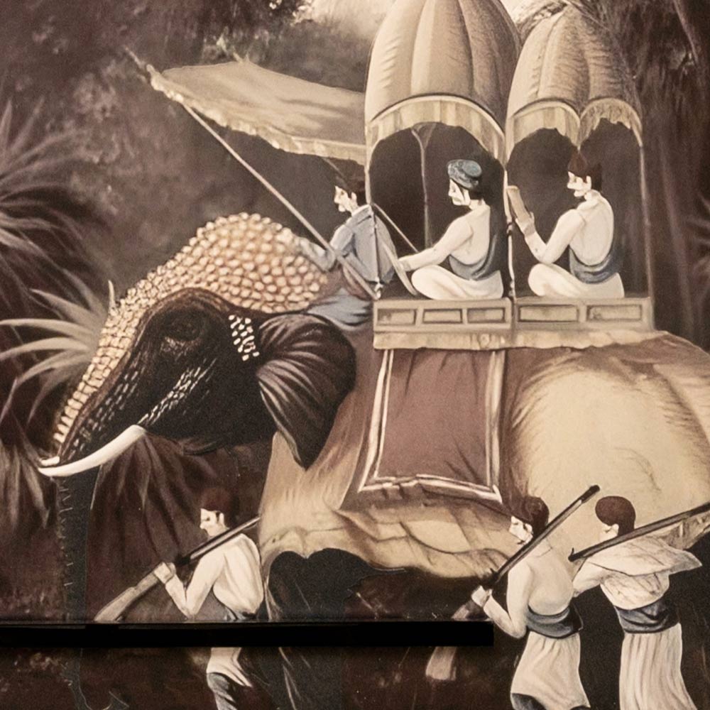 Kompozim panelesh prej druri me printim të një ambienti ekzotik me një elefant dhe 2 dërrasa të zeza pleksiglas në reliev. Me këtë pikturë duam t'i japim dhomës një atmosferë ekzotike dhe tropikale falë printimit të një elefanti me tendë dhe pyllit përreth që e bëjnë kompozimin perfekt për të kompletuar dekorin e çdo dhome. Është bërë tërësisht në Itali me përzgjedhjen e materialeve më të mira dhe me kujdes dhe vëmendje në çdo proces të vetëm prodhimi.