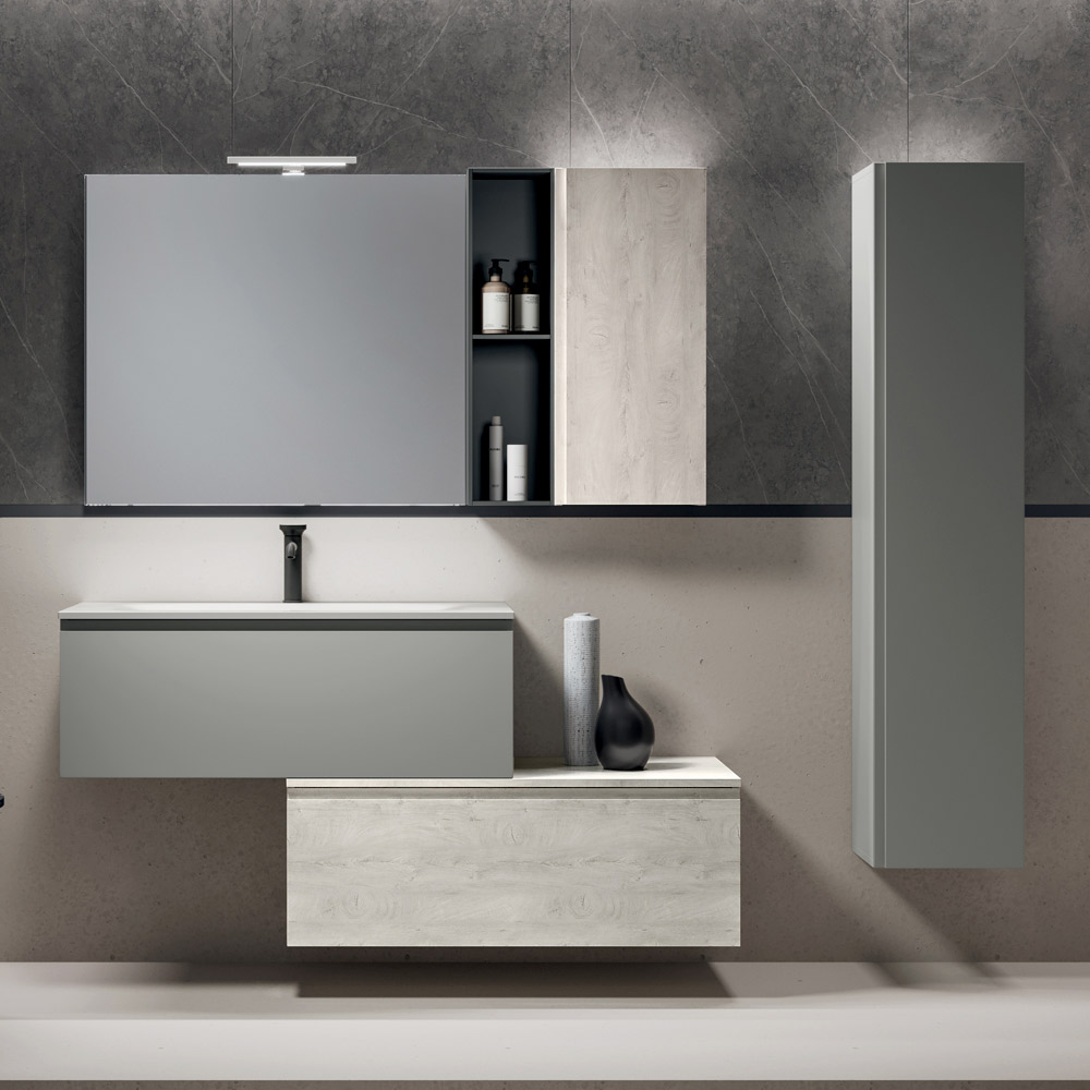 Njësia e varur në mur me ngjyrë lisi të Alaskës dhe elementi i hapur në ngjyrë antraciti e pasurojnë strukturën me zgjidhje funksionale dhe dekorative, ideale për organizimin dhe personalizimin e hapësirës së banjës me elegancë dhe praktikë.