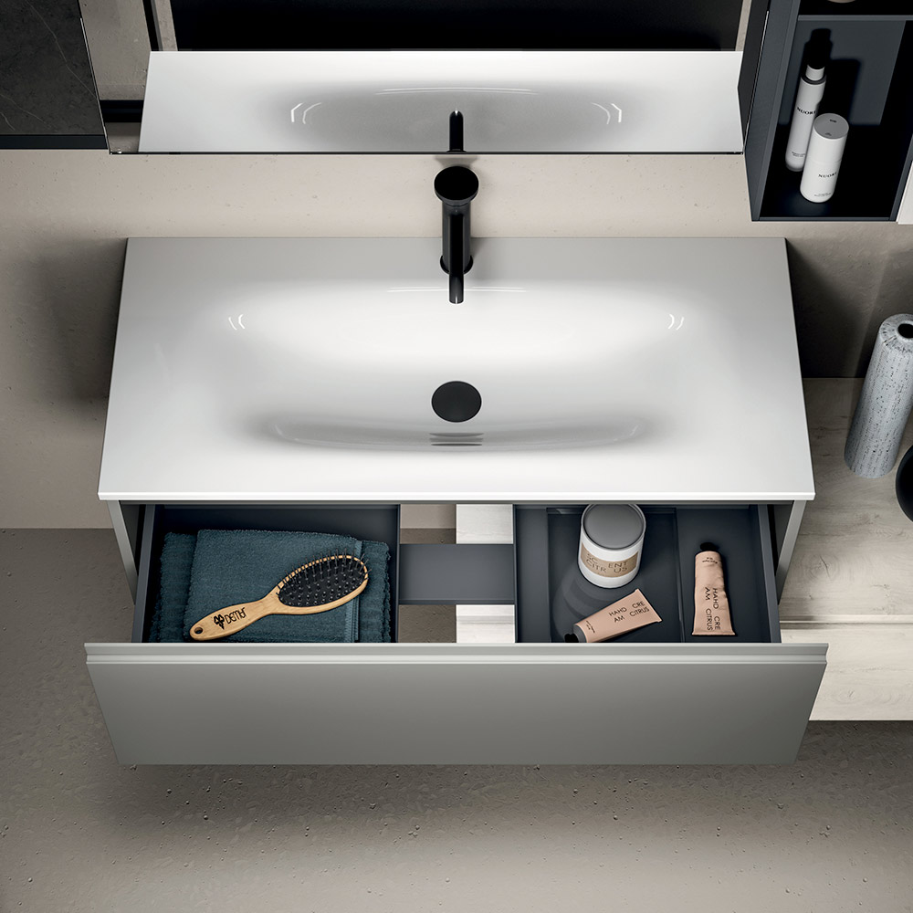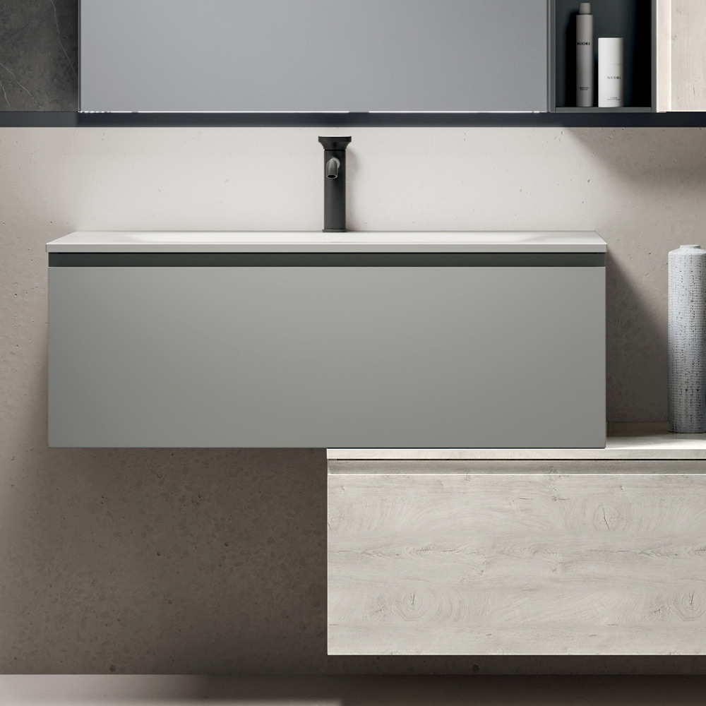 Njësitë bazë të varura me shportë , në ngjyrën gri mat të rafinuar dhe lisi të Alaskës , ofrojnë kapacitet të bollshëm magazinimi dhe ndihmojnë në mbajtjen e dhomës të rregullt dhe të ndriçuar vizualisht.