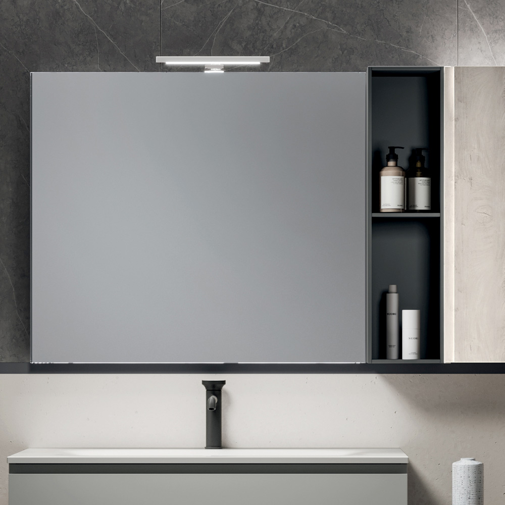 Pasqyra drejtkëndëshe dhe llamba LED e kromit e përmirësojnë të gjithën me një ndriçim të ekuilibruar dhe të rafinuar, të projektuar për të nxjerrë në pah materialet, përfundimet dhe thellësinë e hapësirës.