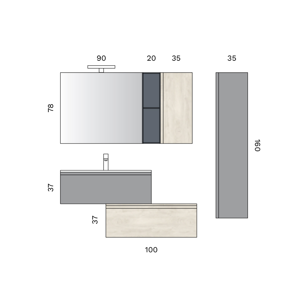 Kompozimi interpreton mobiljet bashkëkohore të banjos me një gjuhë arkitekturore minimaliste, ku vëllimet e ngurta dhe hapësirat e hapura bashkëjetojnë në një ekuilibër të përsosur. Një dizajn i guximshëm, ideal për hapësira moderne dhe elegante.