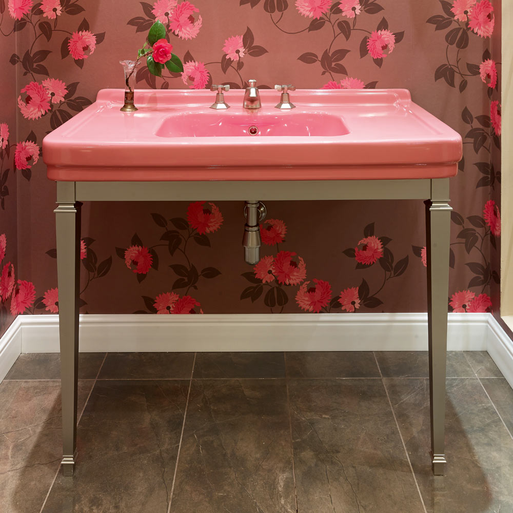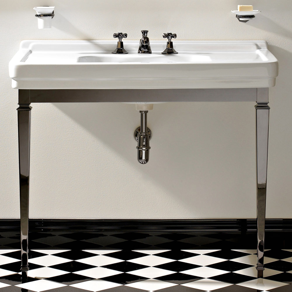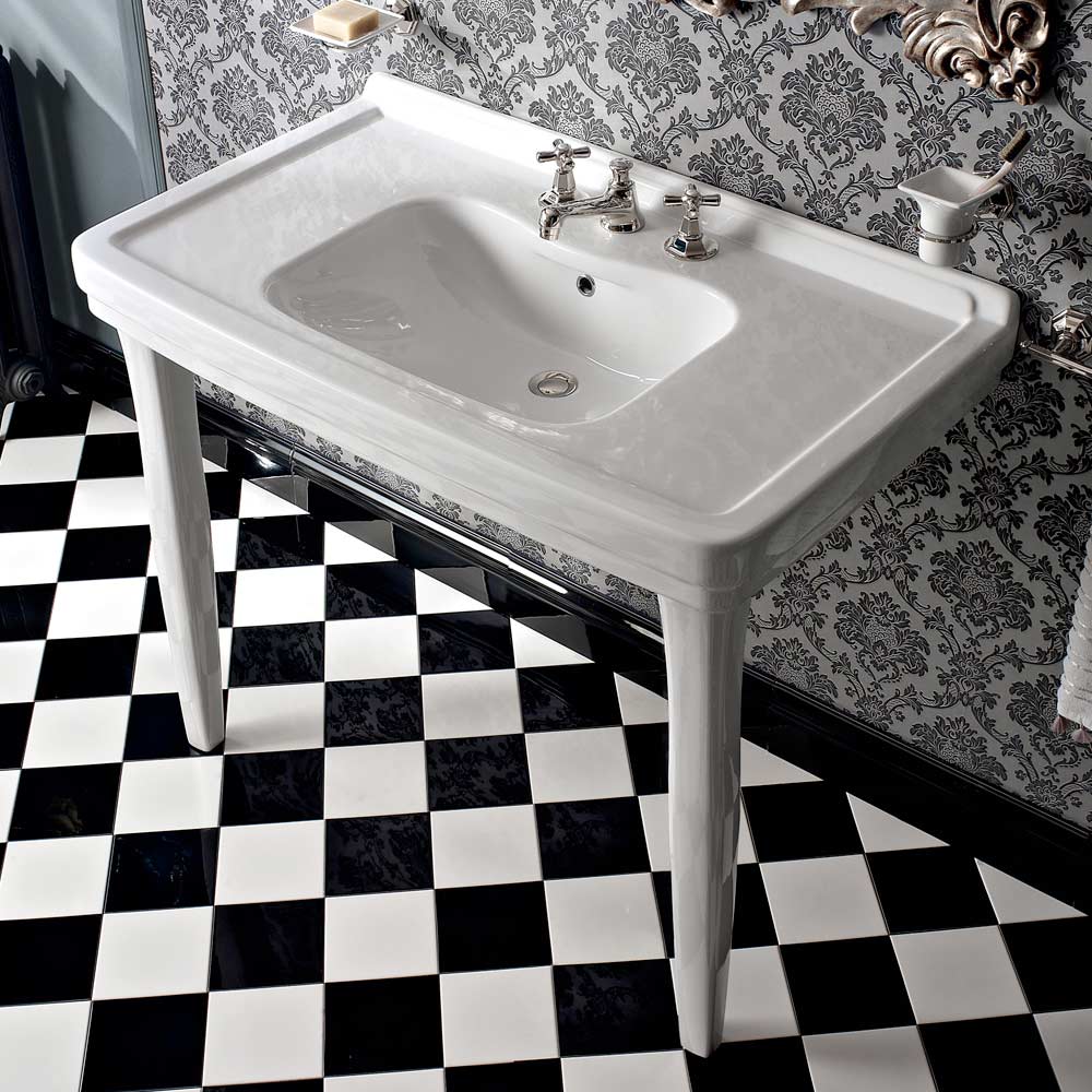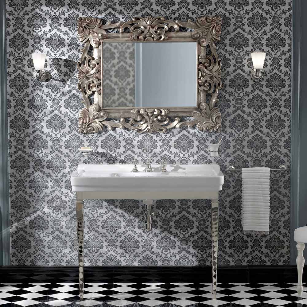 Konzollë banjoje qeramike e bardhë me këmbë metalike, stil i cilësisë së mirë Marwa, i bërë në Itali.