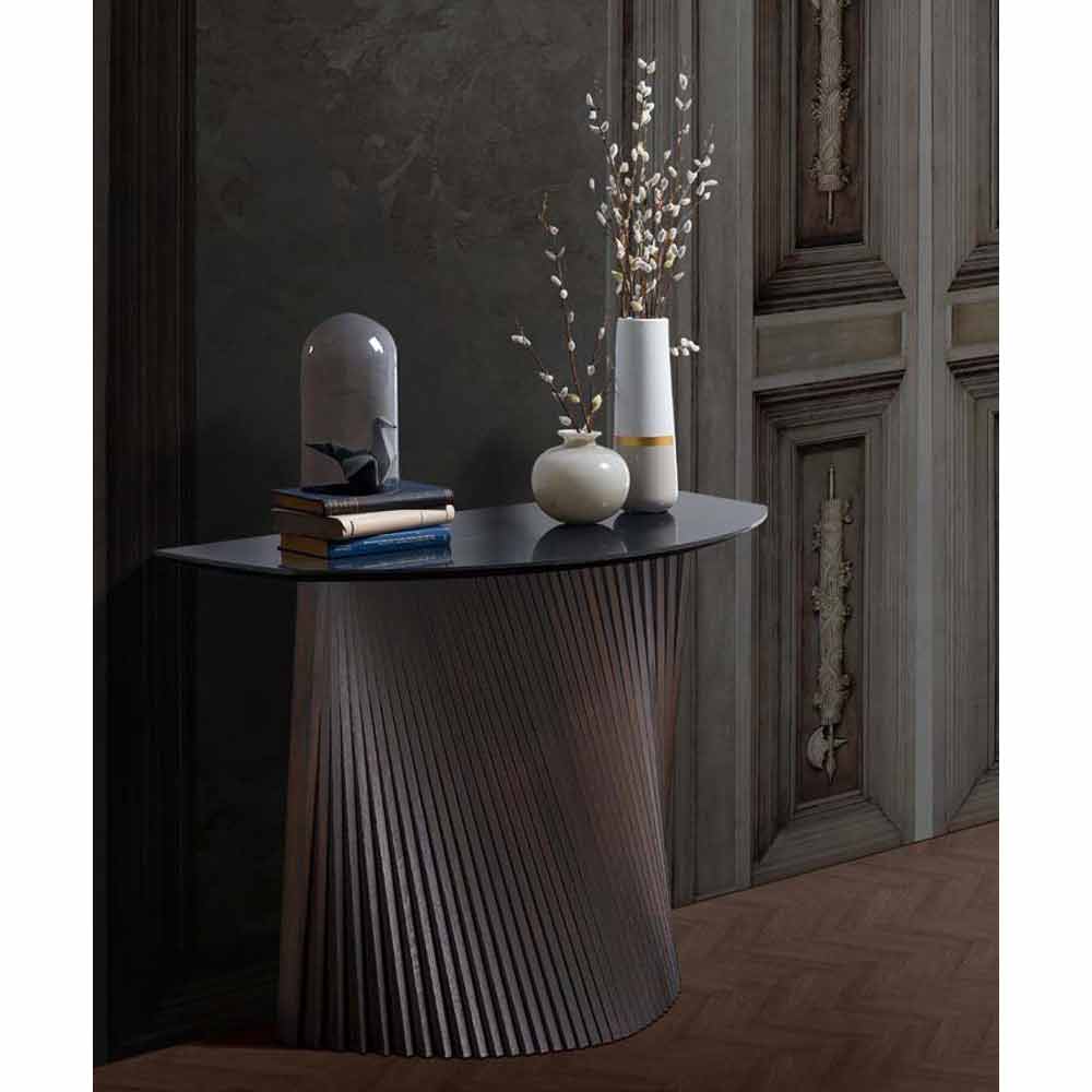 Konsolë fikse e prodhuar në Itali me bazënë pllaka hiri të lyera me dorë me një fund gri të zi të pasuruar me majën gjysmë fuçi në gresi me efekt mermeri . Projektimi i tij karakterizohet nga struktura e veçantë e bazës e cila falë efektit valor të krijuar nga shiritat i jep një sens lëvizjeje dhe dinamizmi vetë artikullit por edhe gjithë dhomës në të cilën është vendosur. Skenike dhe imponuese, kjo tryezë e konzolës demonstron një karakter të fortë dhe një personalitet të përcaktuar mirë, elementë themelorë që e lejojnë atë të pushtojë qendrën e vëmendjes falë edhe kombinimit të mrekullueshëm midis madhështisë së drurit dhe elegancës dhe rafinimit të gresit dhe përfundimeve të tij .
