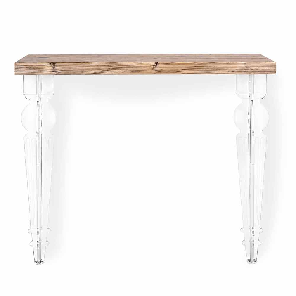 Konsolë muri me dizajn modern në pleksiglas transparente dhe majë në thelb druri, prodhuar në Itali.