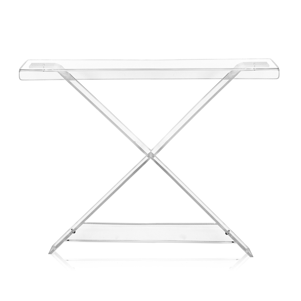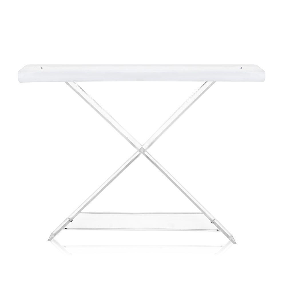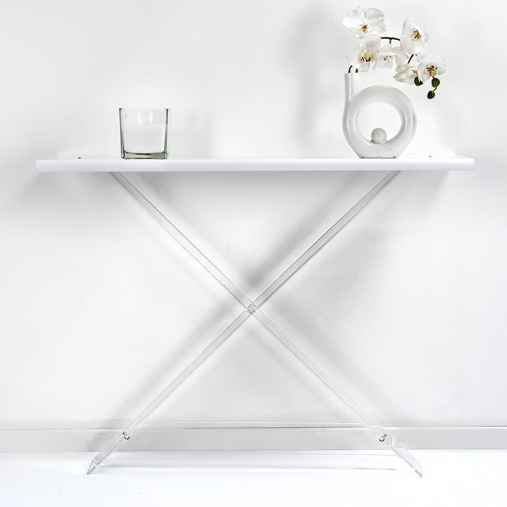 Konsolë dizajni me tone moderne e bërë nga pleksiglas polimer 100% të virgjër , shkëlqimi dhe shkëlqimi i të cilit garantohen me kalimin e kohës. Konzola e vendosur në hyrje të shtëpisë, në dhomën e ndenjes ose në dhomën e gjumit, krijon një dizajn modern dhe një atmosferë mikpritëse. Dekoroni pjesën e sipërme me tabaka, kuti bizhuterish, elemente dekorative si bimë, vazo, fotografi, duke personalizuar ambientin me lehtësi dhe shije. E lehtë dhe lehtësisht e transportueshme dhe e ripozicionueshme në dhoma të ndryshme të shtëpisë.