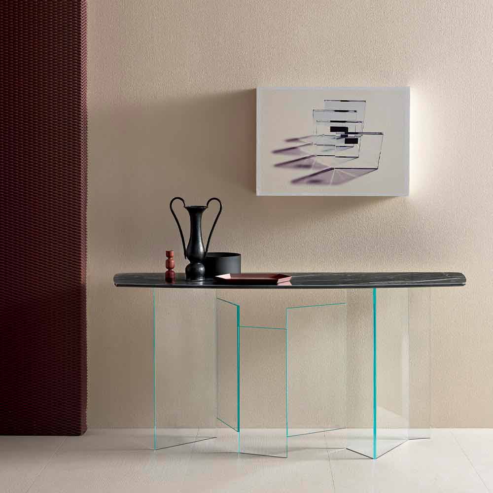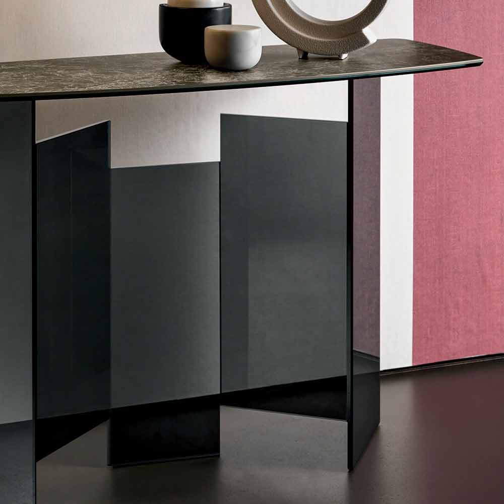 Shtëpi moderne e dhomës së ndenjes me Emperador ose Noir Desir qeramika e lartë dhe baza e qelqit, e realizuar me dorë në Itali.
