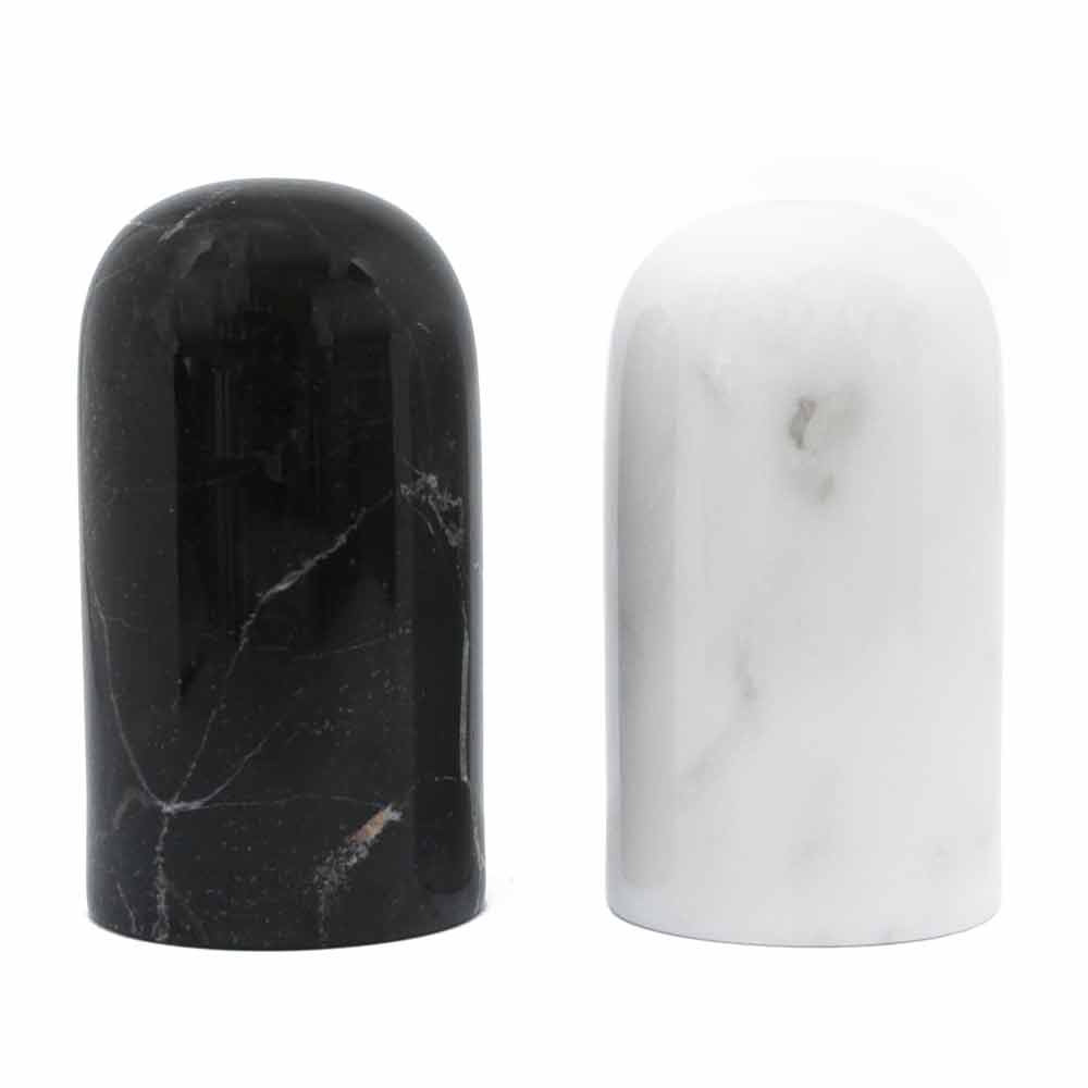 Enë kuzhine për kripë dhe piper në mermer të bardhë Carrara dhe Marquinia të zezë Prodhuar në Itali.