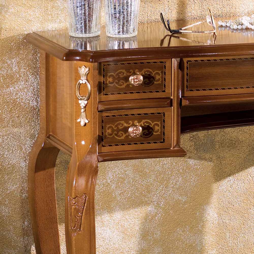 Konsolë salle e stilit klasik me 5 sirtarë tërësisht prej druri dhe e disponueshme me dekorime arre me shkëlqim ose të bardhë dhe ari, me inlays. Ky komplement është i përshtatshëm me elegancën e tij në çdo ambient, unik dhe i rafinuar, është bërë tërësisht në Itali nga mjeshtër të aftë , i përfunduar me mençuri dhe shije për elegancë. Prodhimi kryhet duke përdorur materiale të shkëlqyera , dhe duke kryer punënmedorë me kujdesin dhe profesionalizmin maksimal që i dallon produktet Made in Italy .