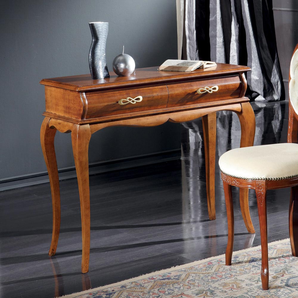 Konzola hyrëse e stilit luksoz dhe klasike prej druri , e disponueshme në ngjyrë arre ose të bardhë dhe argjendi. Kjo mobilie praktike dhe e rafinuar ka një sirtar dhe është bërë tërësisht në Itali nga mjeshtra të aftë , e përfunduar me mençuri dhe shije për elegancë. Prodhimi kryhet duke përdorur materiale të shkëlqyera , dhe duke kryer punënmedorë me kujdesin dhe profesionalizmin maksimal që i dallon produktet Made in Italy .