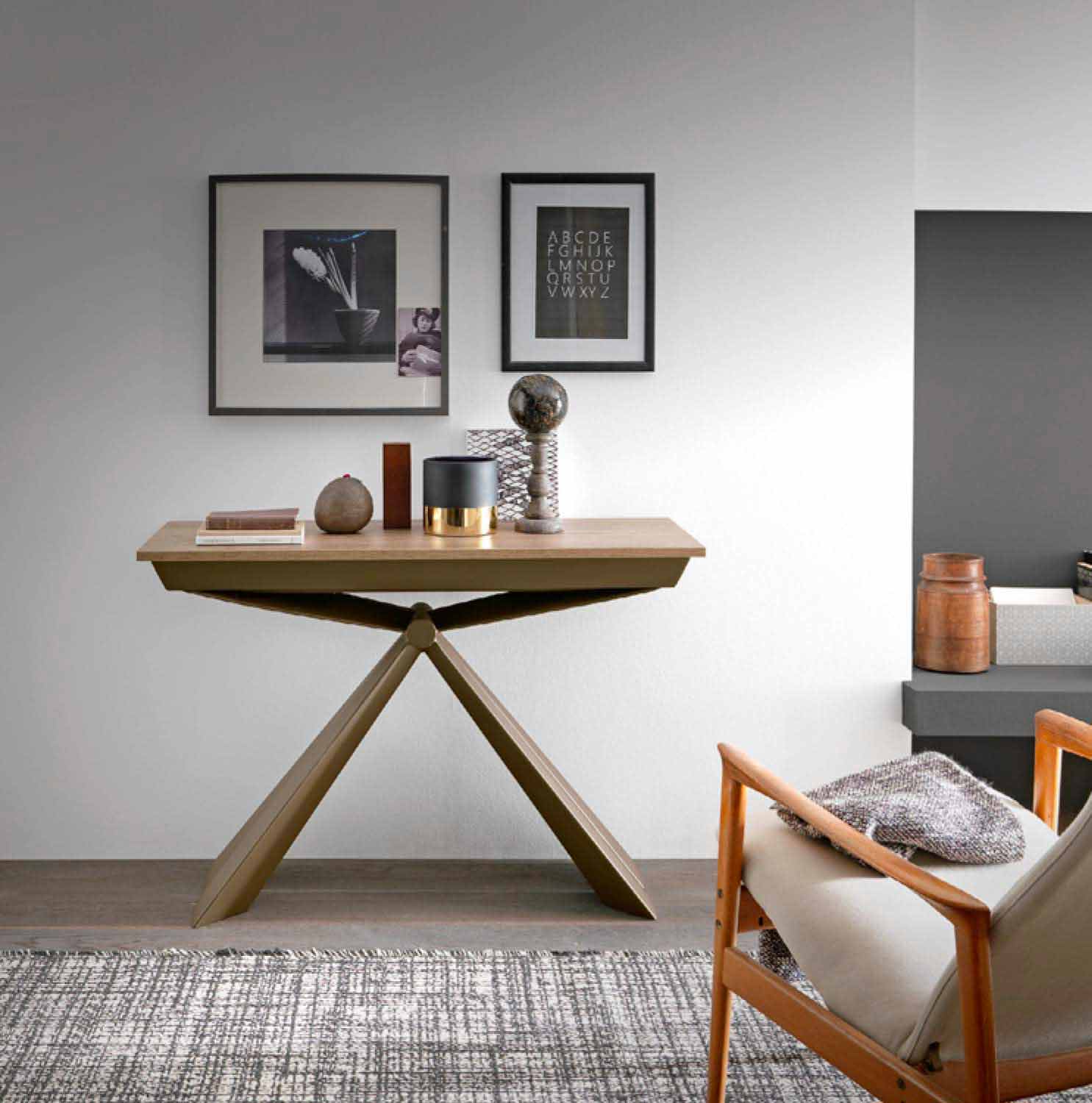 Konsolë e konvertueshme në tavolinë ngrënieje me majë prej druri melamine dhe strukturë metalike Prodhuar në Itali.