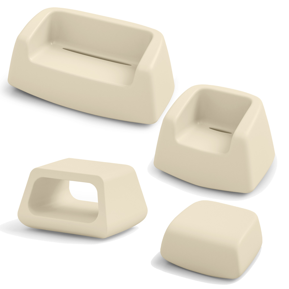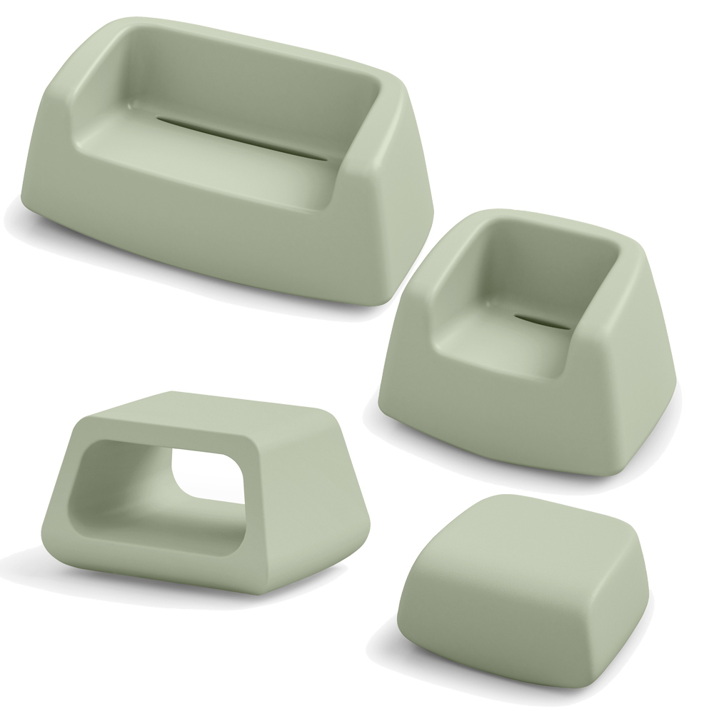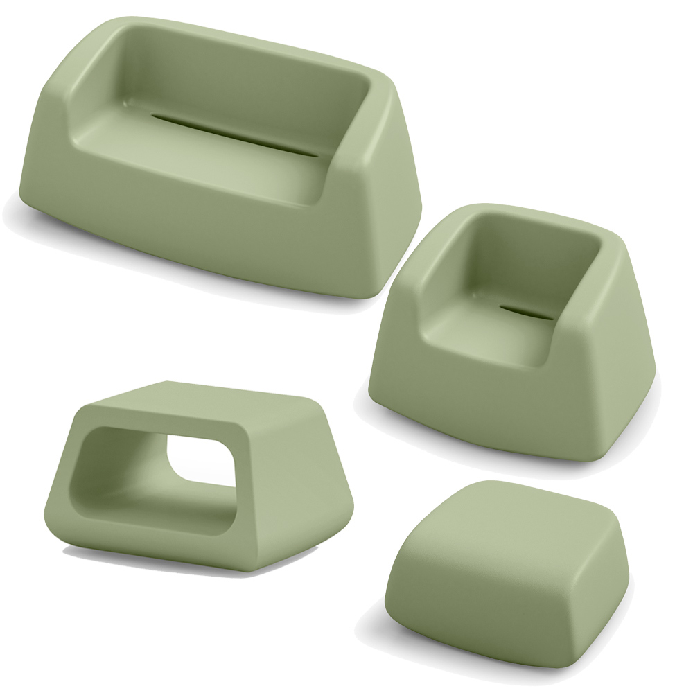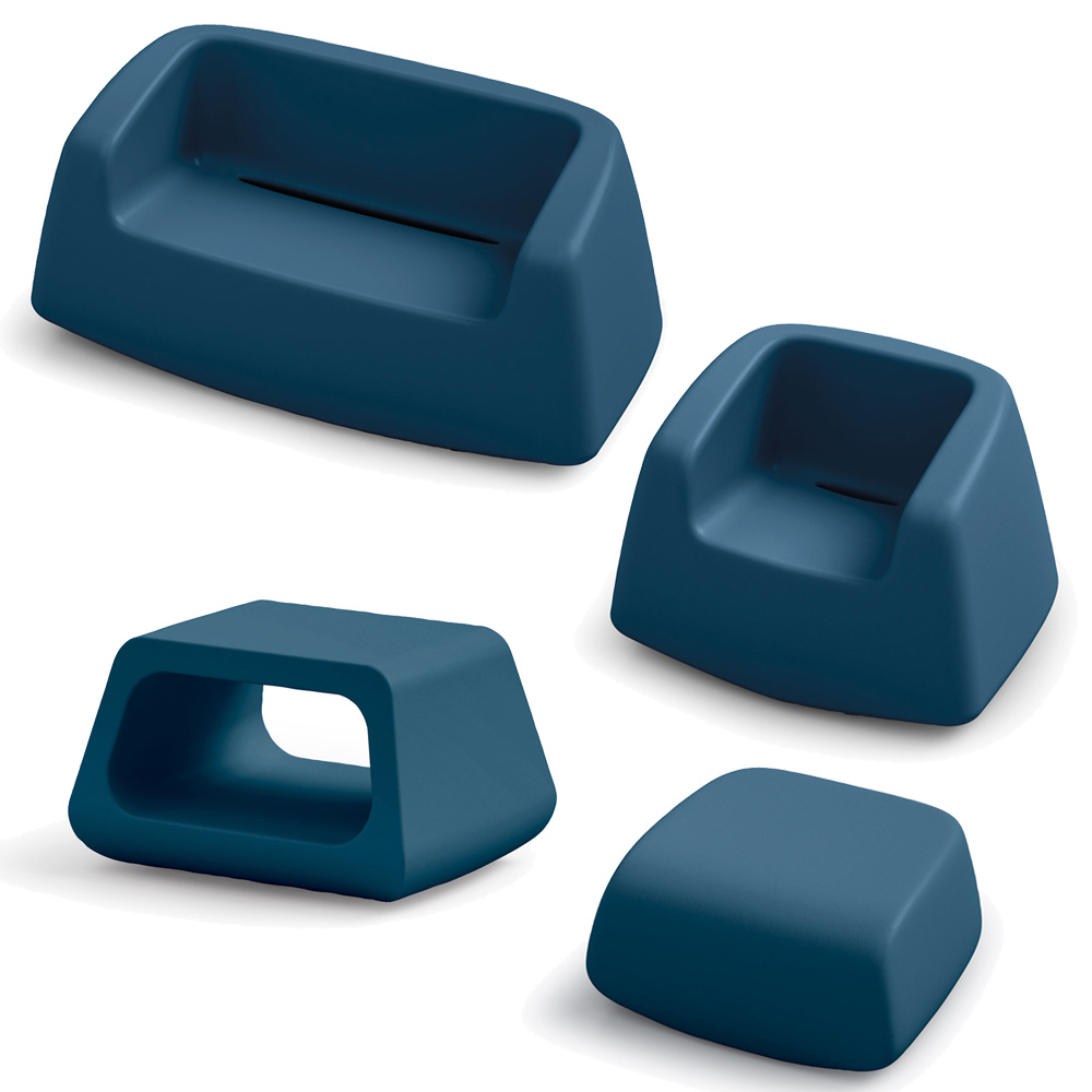 Përbërja përfshin një kolltuk, një divan të shoqëruar me një tavolinë kafeje dhe një pouf.