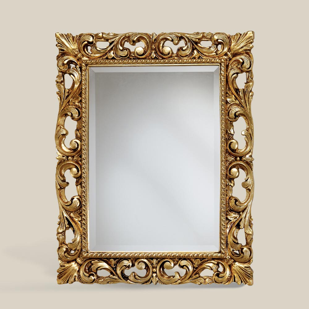 Pasqyrë elegante e stilit klasik me kornizë drejtkëndëshe të përfunduar në fletë ari , e projektuar për të mobiluar çdo ambient me personalitet dhe origjinalitet. Një komplement unik dhe i rafinuar, i prodhuar tërësisht në Itali dhe i punuar me dorë nga mjeshtra të aftë , mjeshtër të artit që e përfundojnë çdo komplement me mençuri dhe shije për elegancë. Prodhimi kryhet duke përdorur materiale të shkëlqyera , dhe duke kryer punënmedorë me kujdesin dhe profesionalizmin maksimal që i dallon produktet Made in Italy .