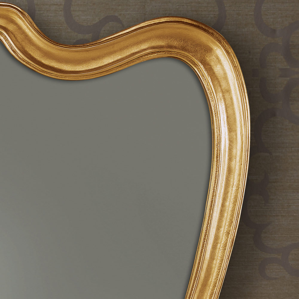 Pasqyrë në formë me kornizë druri e zbukuruar me fletë ari . Falë stilit të saj klasik , kjo pasqyrë është ideale për t'i dhënë një prekje elegante dhe luksoze çdo ambienti. Një komplement unik dhe i rafinuar, i bërë tërësisht në Itali nga mjeshtra të aftë , mjeshtër të artit që përfundojnë çdo komplement me mençuri dhe shije për elegancë. Prodhimi kryhet duke përdorur materiale të shkëlqyera , dhe duke kryer punënmedorë me kujdesin dhe profesionalizmin maksimal që i dallon produktet Made in Italy .