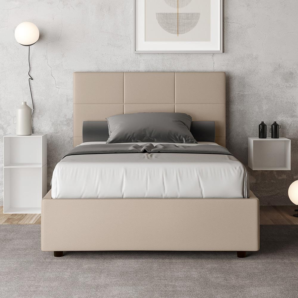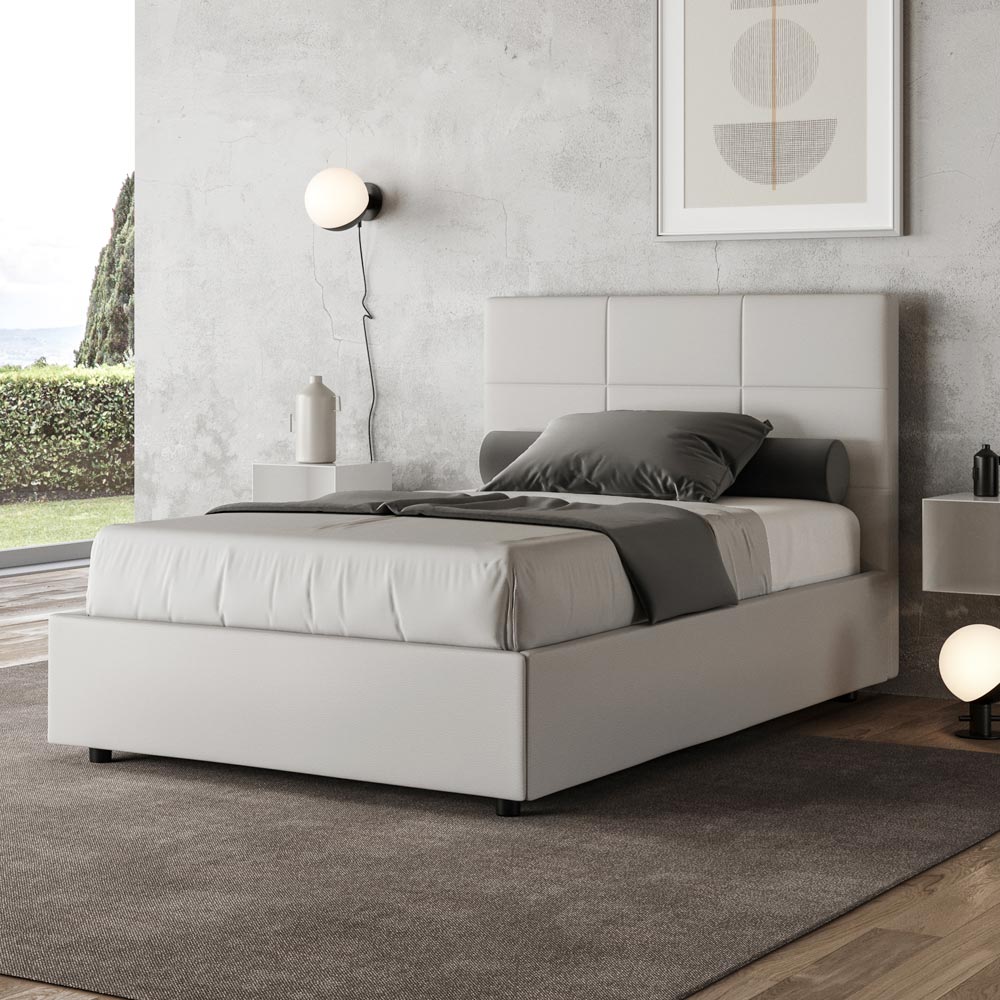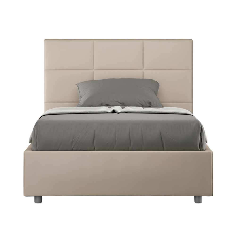 Krevat dopio me mbushje 120x200 cm, i bërë nga panele druri të grimcuar dhe i mbuluar me lëkurë imituese , tërësisht i prodhuar në Itali. Ky krevat, me kornizën e tij të mbushur, është shembulli i përsosur se si eleganca dhe rehatia mund të kombinohen në një mobilje të vetme. Ky model karakterizohet ngaKoka e shtratit e pasuruar me modele gjeometrike drejtkëndëshe . E veshur me lëkurë artificiale, është e lehtë për t'u mbajtur e pastër: vetëm një leckë mikrofibre është e mjaftueshme për pastrim të shpejtë dhe efektiv.