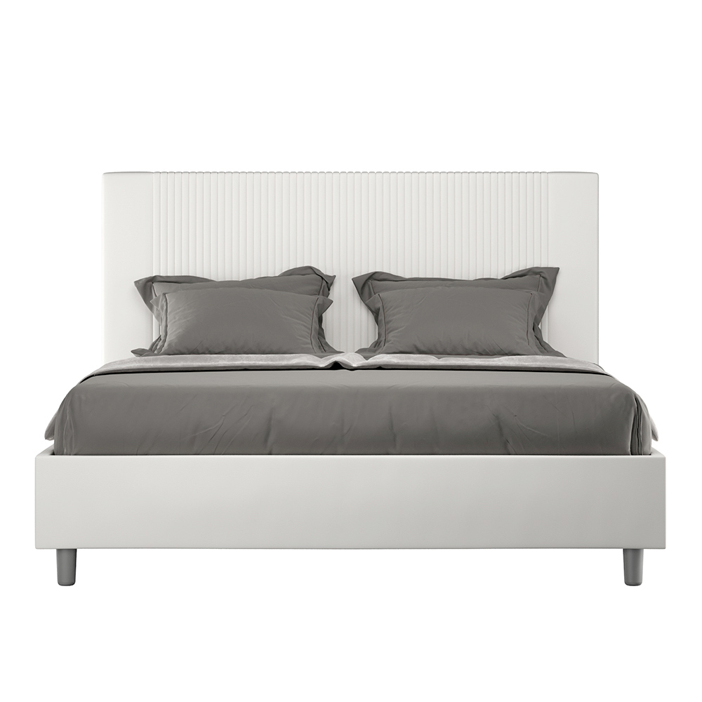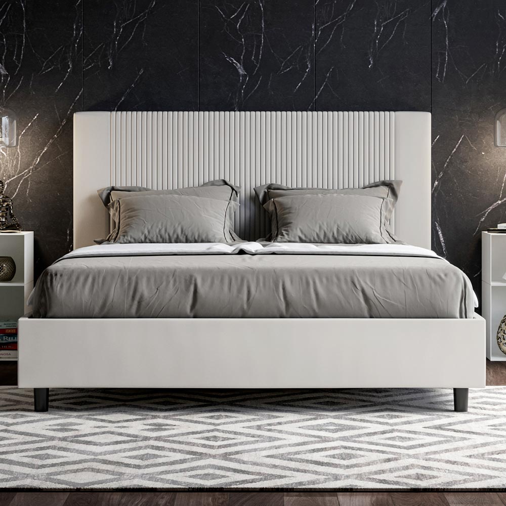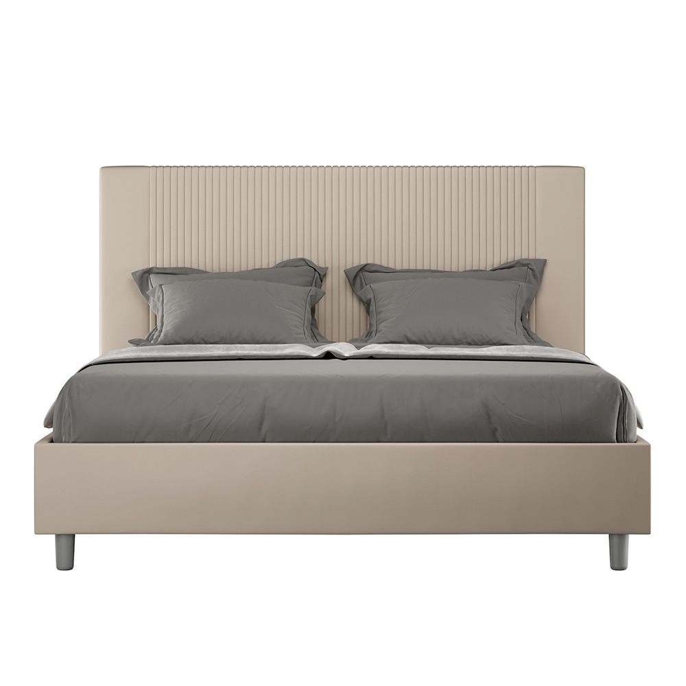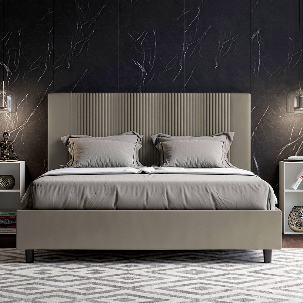 Krevat dopio i mbushur 160x200 cm i bërë nga panele kartoni dhe i mbuluar me lëkurë imituese , i prodhuar tërësisht në Itali. Ky krevat dopio, me kornizën e tij të mbushur, është një produkt italian i punuar me lëkurë artificiale. Dizajni i tij i thjeshtë por modern është perfekt për hapësirat që dallohen nga eleganca e sofistikuar. Karakteristika kryesore e këtij modeli është koka e shtratit, e zbukuruar me një motiv vijash vertikale , ideale për ata që duan ta kombinojnë atë me hapësira vizualisht tërheqëse me mure të spikatura, duke ruajtur një elegancë të pamohueshme.
