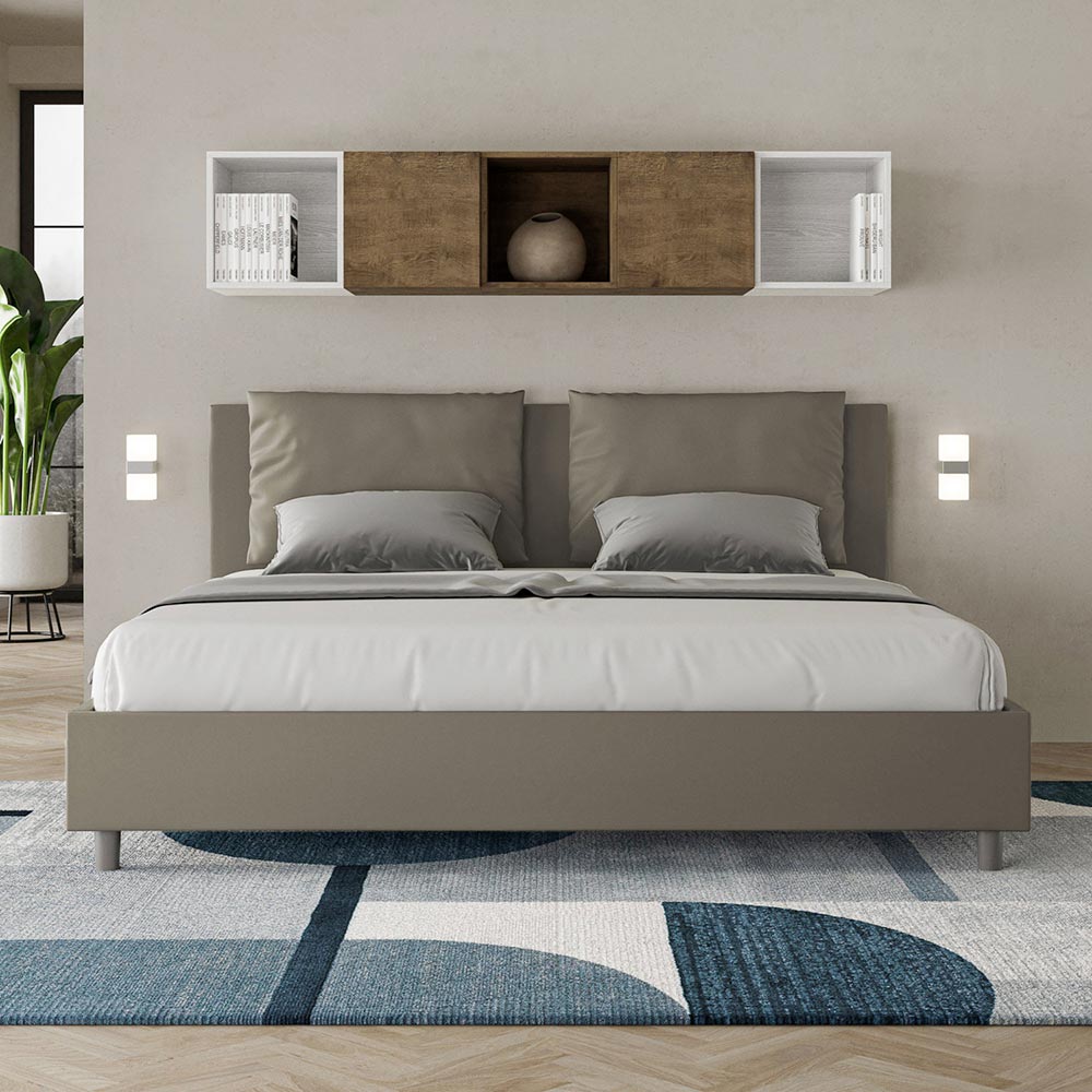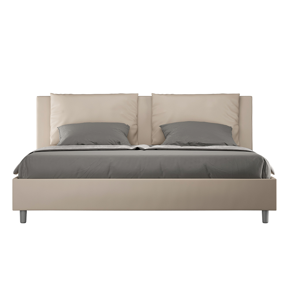 Krevat dopio me përmasa 180x200 cm, i mbushur me panele melamine dhe i mbuluar me lëkurë artificiale , i prodhuar tërësisht në Itali. Ky krevat king size me një kornizë të veshur me tapiceri mishëron në mënyrë të përkryer avantazhet e një krevati të veshur me tapiceri: rehatinë, stilin bashkëkohor, funksionalitetin dhe përdorimin efikas të hapësirës . Ky krevat, me kokën e tij të mbushur me bollëk, ofron një kënd relaksues ideal për të lexuar ose për të parë televizor, duke i dhënë një pamje më të këndshme dhomës suaj të gjumit. Elegant dhe me stil, ky krevat është i veshur me lëkurë artificiale, duke e bërë pastrimin të shpejtë dhe të lehtë: thjesht fshijeni me një leckë mikrofibre për ta mbajtur të shkëlqyeshëm.