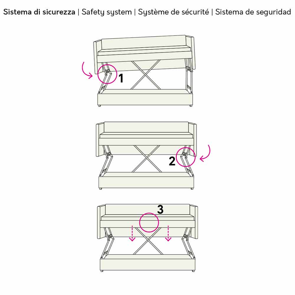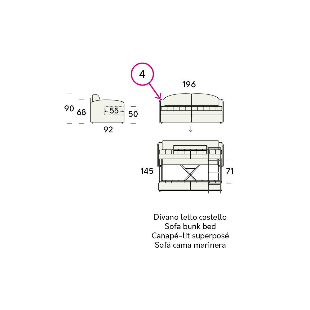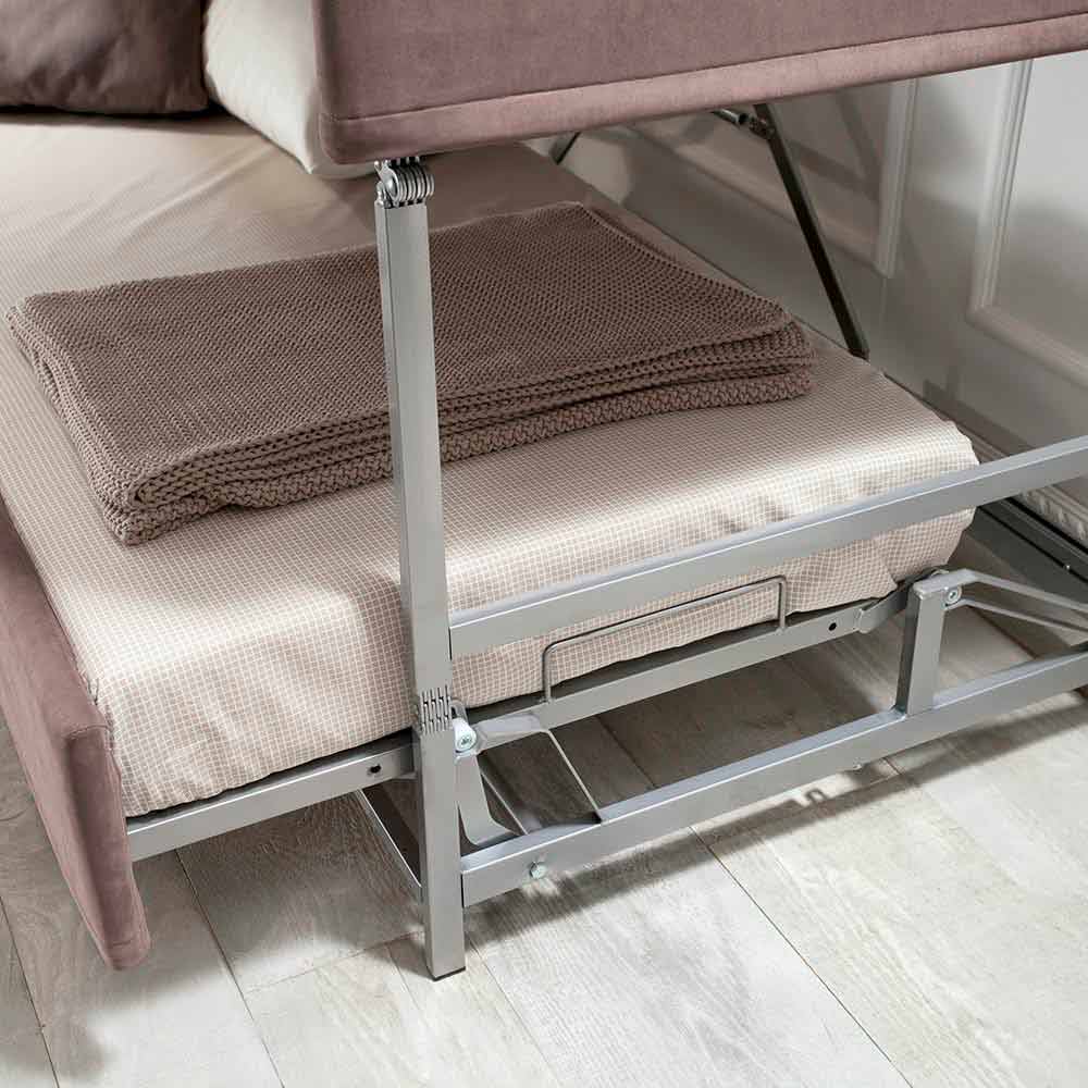 Krevat divani marinari i prodhuar në Itali me mbushje jo-deformuese të shkumës poliuretani dhembulesë në pëlhurë kafe (plotësisht e lëvizshme) me jorgan të bardhë. Ai gjithashtu përfshin një rrjet mekanik me një kornizë tubi çeliku që mbështet peshën e dy të rriturve pa deformuar dhe 2 dyshekë shkumë poliuretani jo-deformues (dendësia 25 kg / m3). Një ide funksionale që nuk heq dorë nga pamja, duke arritur të ofrojë një shtrat të dytë pa rritur madhësinë e tij falë mekanizmit praktik të marinarit . Çdo detaj studiohet për rehati dhe qetësi maksimale falë sistemit të hapjes me tre pajisje sigurie që transformojnë shtratin në një divan dhe anasjelltas dhe rrjetit që del me 30 cm për të lehtësuar dhe përshpejtuar përgatitjen e shtratit të poshtëm. Për ta mbyllur përsëri, do të jetë e mjaftueshme të lirohen dy mbështetëset anësore, të cilat do të qëndrojnë të bllokuara derisa të lirohet edhe ndalesa qendrore. Krevati i divanit është gjithashtu i pajisur me një shkallë praktike dhe shinë anësore për një garanci edhe më të madhe të sigurisë.