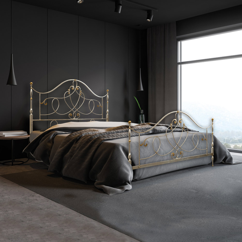 Krevat dopio i bërë me ballë krevati dhe dërrasë të koordinuar prej hekurituba të përfunduar me shtresë pluhuri ose pikturë me gjethe të punuar me dorë. Me këtë shtrat ne duam t'i bëjmë homazh traditës duke krijuar një ekuilibër të përsosur midis inovacionit dhe modeleve klasike duke kombinuar përfundimet dhe ngjyrat elegante dhe të rafinuara. Në dhomën e gjumit krijohet një atmosferë e kohëve të shkuara e cila mirëpret dhe përkëdhelë personin.