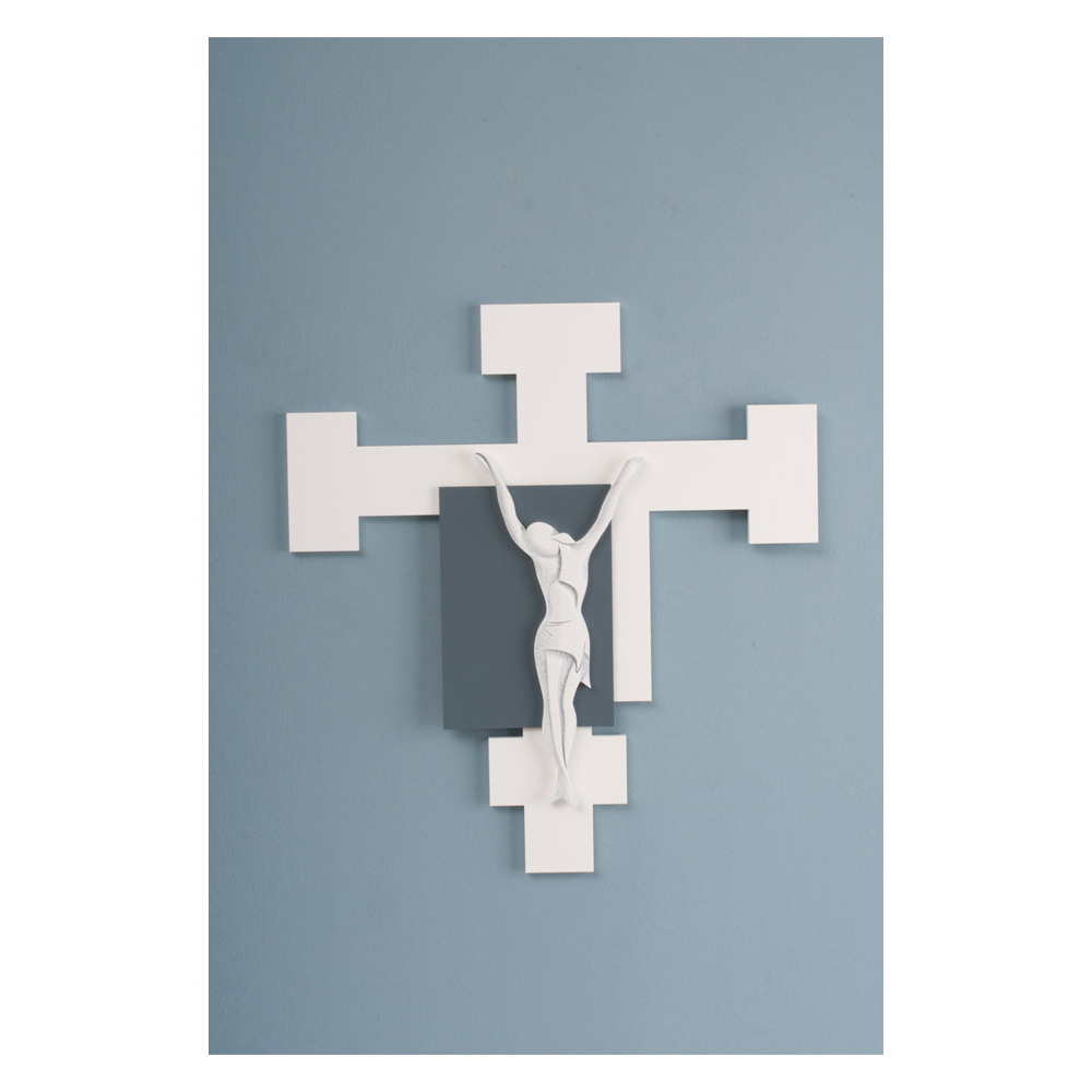 Kryq në dru me llak të bardhë me aplikim të detajit në llak blu dhe të bardhë Christ me gdhendje të lehta të detajeve të trupit.