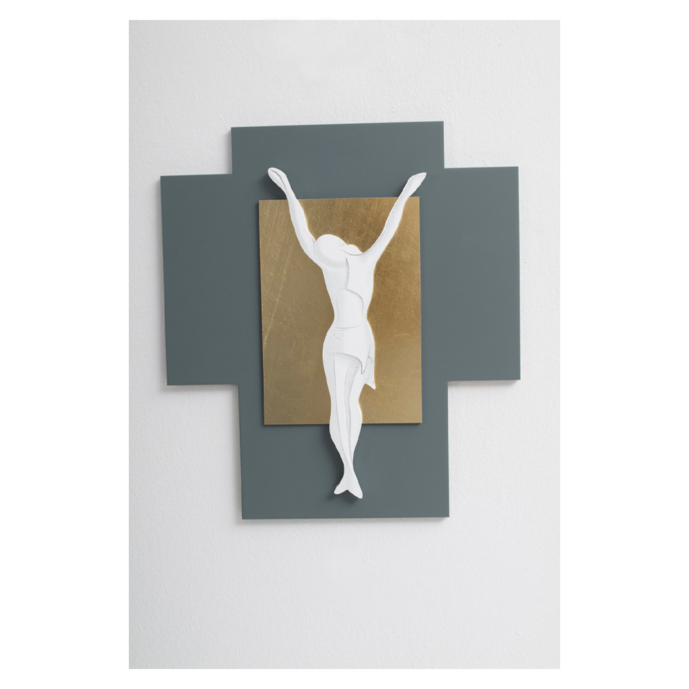 Kryq në dru me llak blu me aplikim të një katrori në fletë ari të çmuar dhe Jezusi në dru të bardhë të llakuar me gdhendje të lehta lazer.