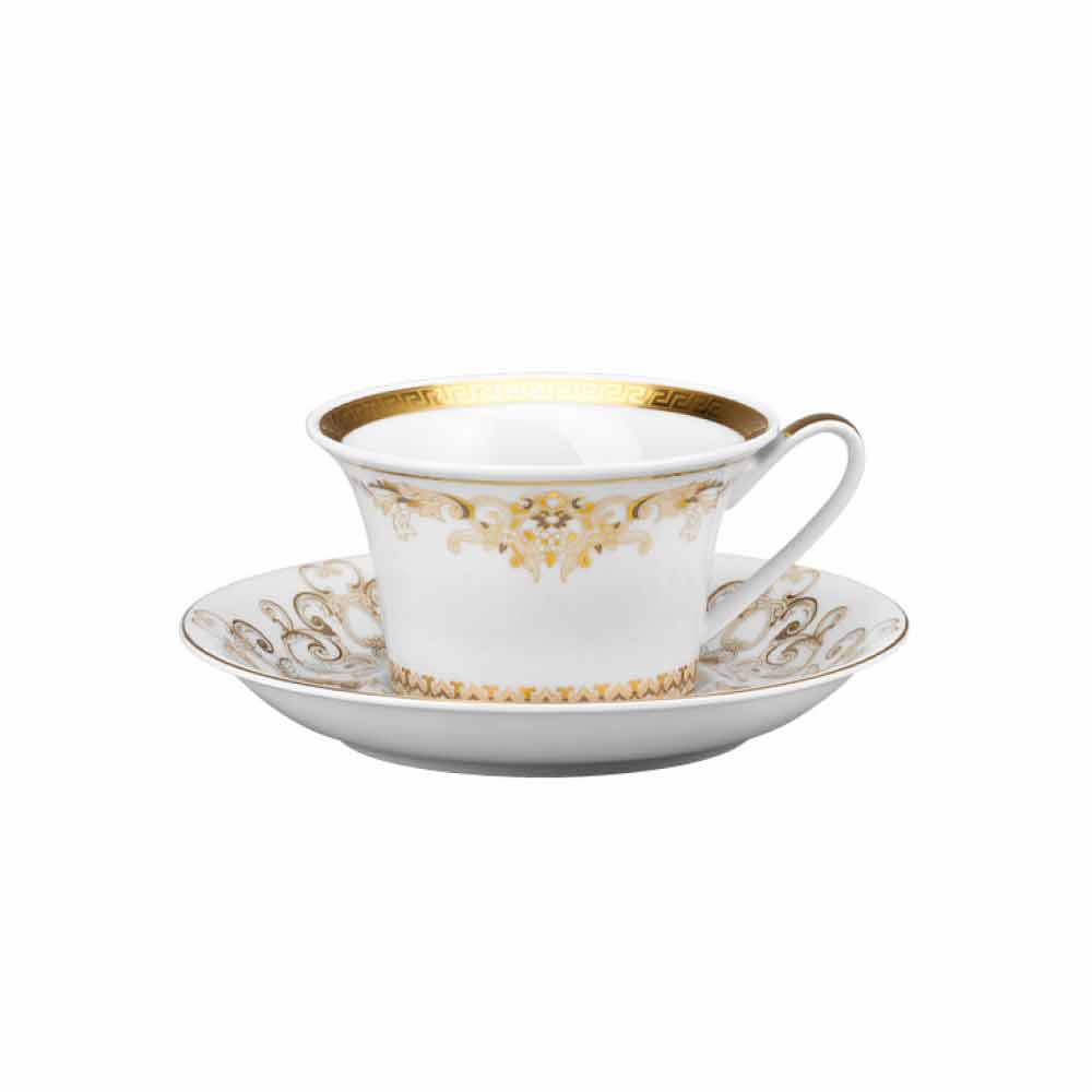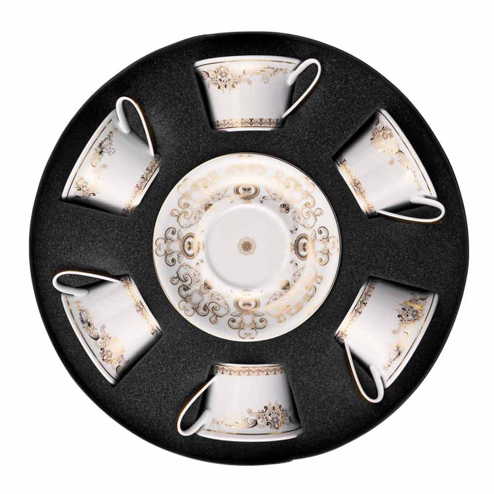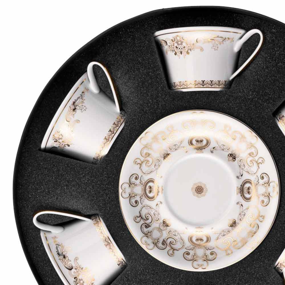 Set filxhani çaji prej porcelani Versace Medusa Gala Gold me 6 pjesë Në këtë set me 6 filxhanë çajii gjithë sqima dhe luksi i koleksionit të ri të sendeve të tavolinës Medusa Gala është i mbyllur, i cili riinterpreton motivet tradicionale të Versace në dizajnin dhe dekorimin e tij: ikona që përshkruan Medusa alternohet me ornamente të rafinuara barok në një filigran ari të çmuar. Një efekt emocionues i kontrasteve midis bardhësisë së porcelanit dhe arit të pastër krijon një vend të përsosur, modern dhe në të njëjtën kohë unik. E pasuruar me motive dhe dekorime tërësisht në ar, Medusa Gala vjen edhe në versionin edhe më luksoz "Gold", perfekt për të integruar dhe zbukuruar më tej tryezën.