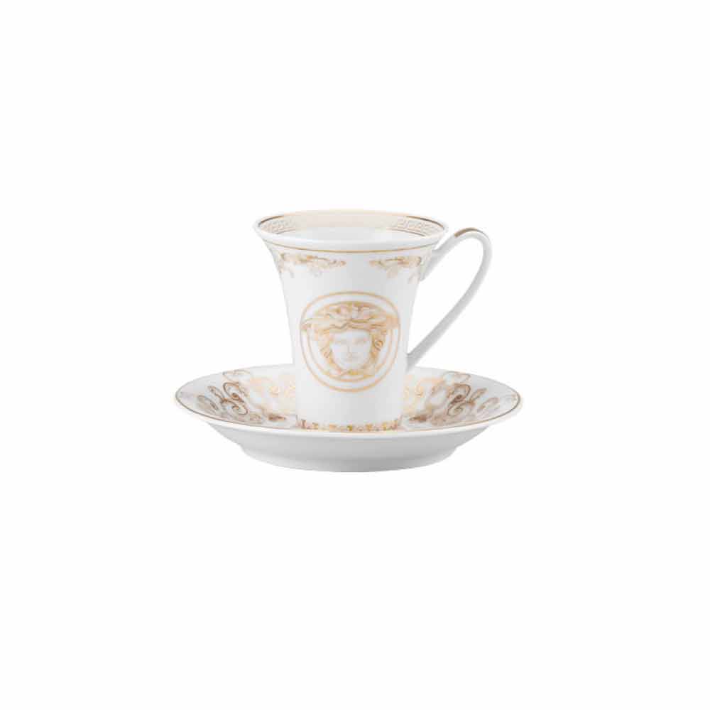 Porcelani për filxhan kafeje Rosenthal Versace Medusa Gala Filxhani dhe pjata e rafinuar e kafesë nga Versace është pjesë e koleksionit të rafinuar dhe luksoz të tavolinave Medusa Gala. Frymëzuar nga bujaria dhe atmosfera unike e darkave gala, Medusa Gala riinterpreton motivet tradicionale të Versace në dizajn dhe dekorim: përshkrimi ikonik i Medusa-s alternohet me ornamente të rafinuara barok në një filigran ari të çmuar. Një efekt kontrasti emocionues midis bardhësisë së porcelanit dhe arit të pastër i jep jetë një ambienti të përsosur, modern dhe në të njëjtën kohë unik. E pasuruar me motive dhe dekorime tërësisht në ar, Medusa Gala vjen në një version edhe më luksoz "Gold", perfekt për të integruar dhe zbukuruar më tej tryezën.